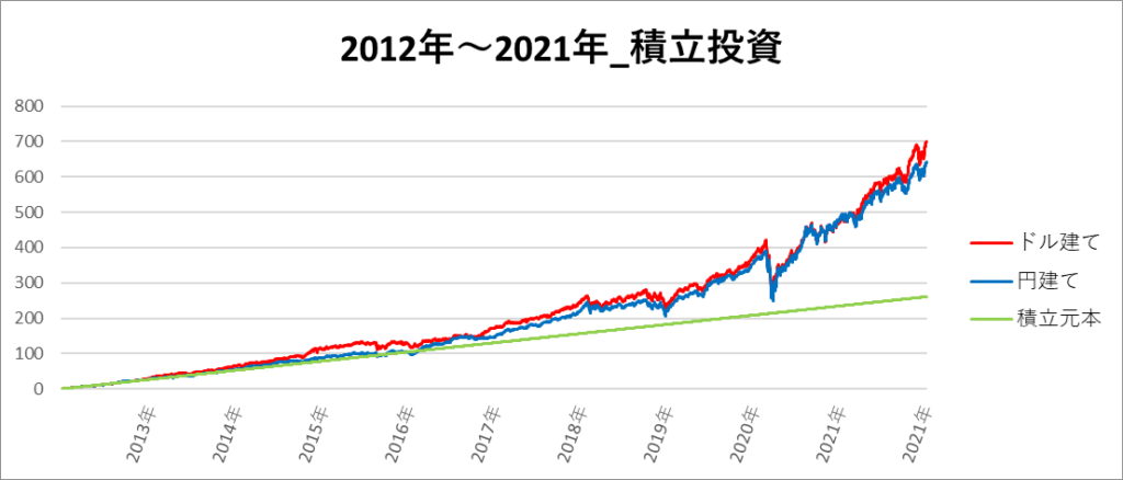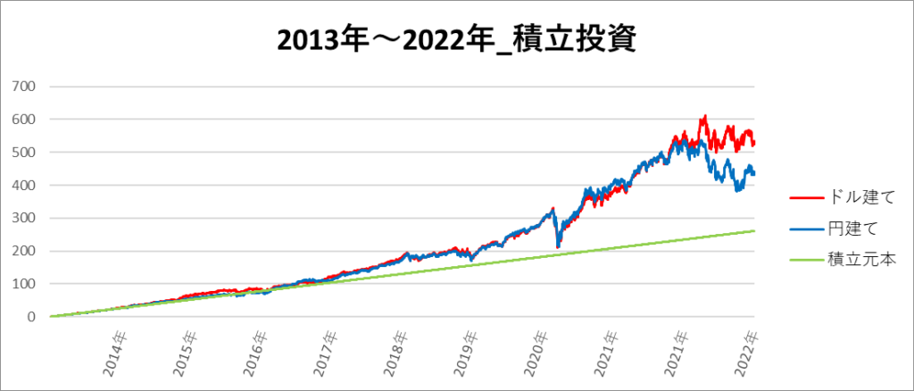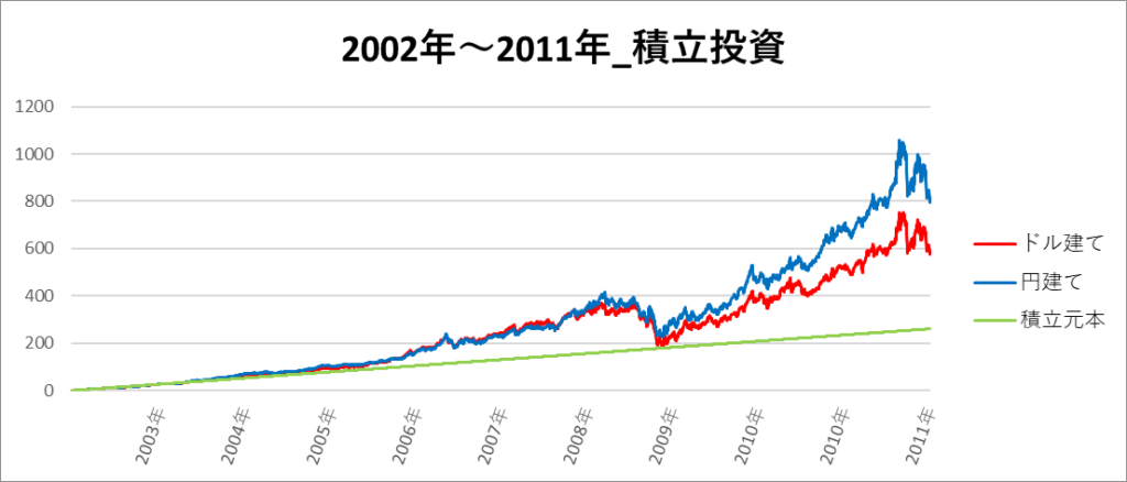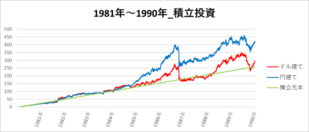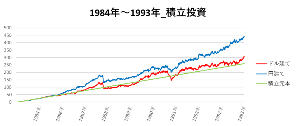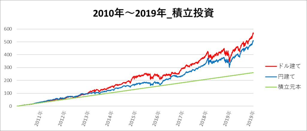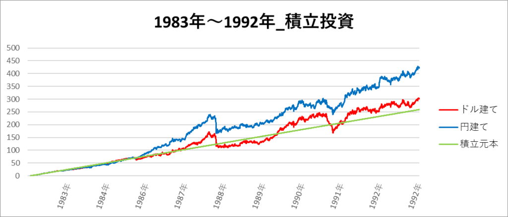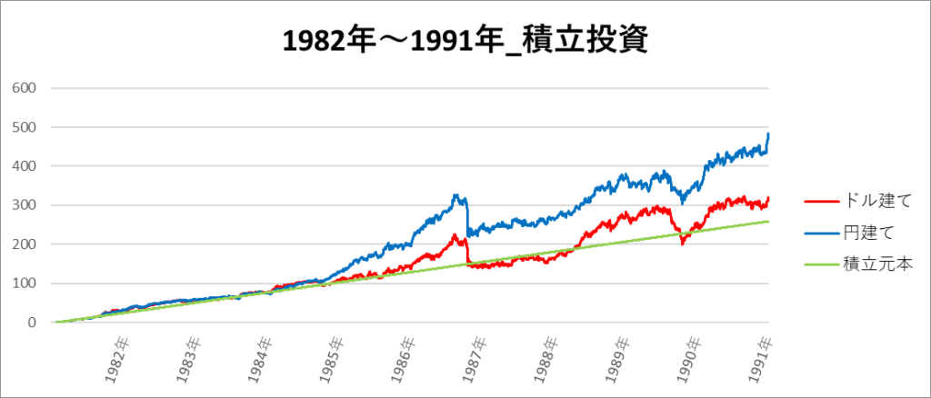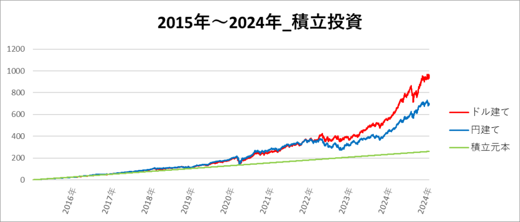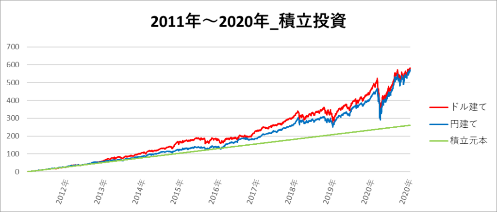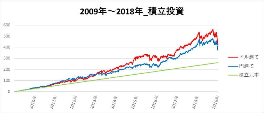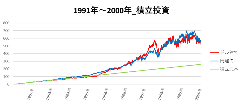 円建てとドル建ての2パターンを比較できるようにグラフに表記しているので、見比べて見てください。