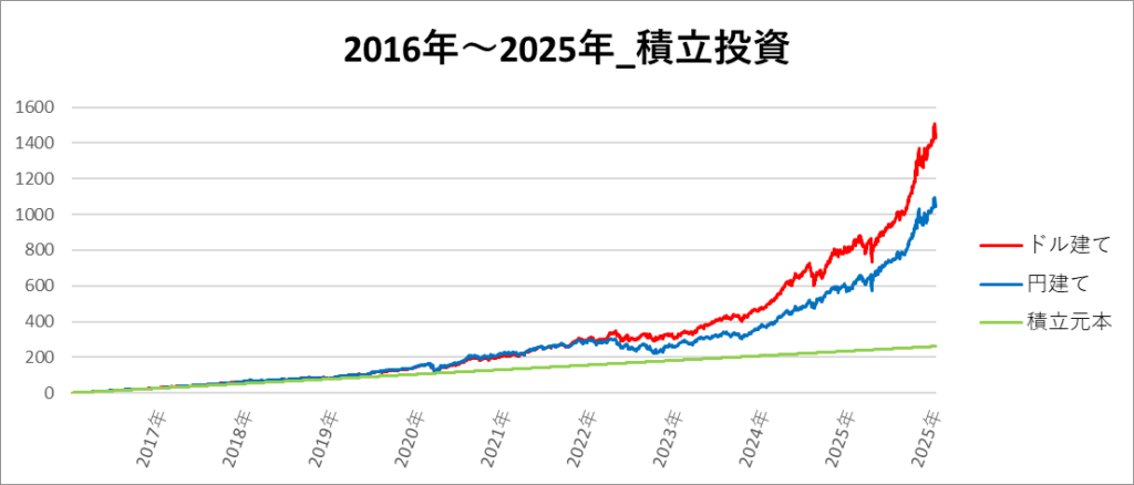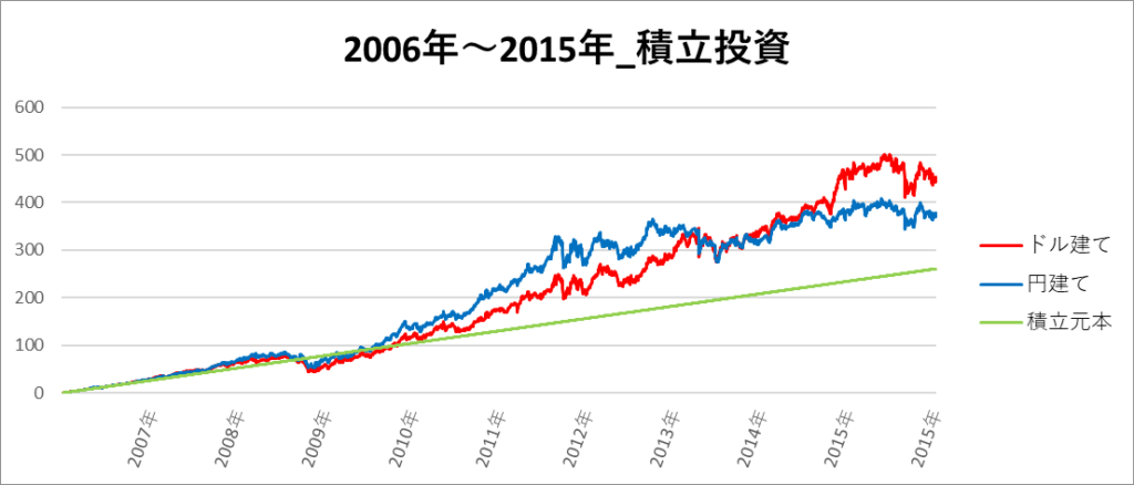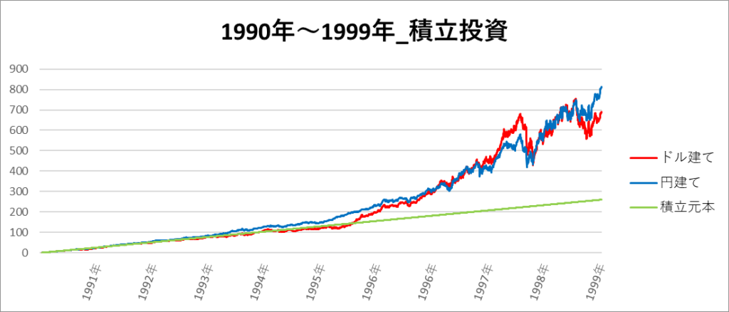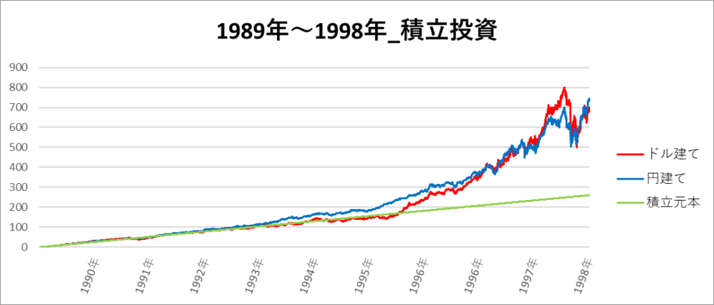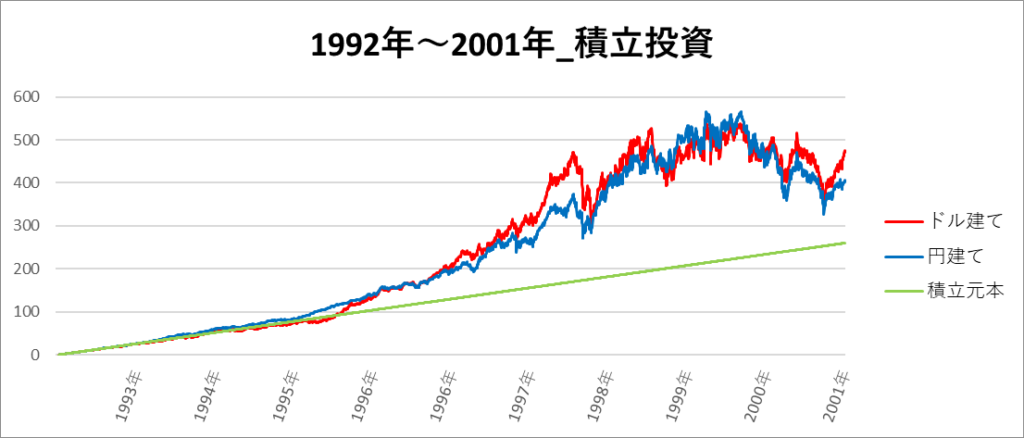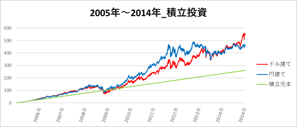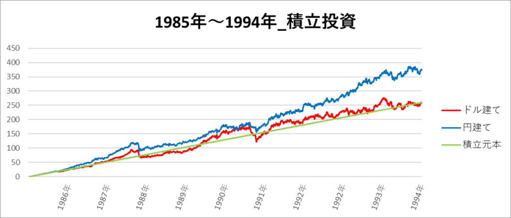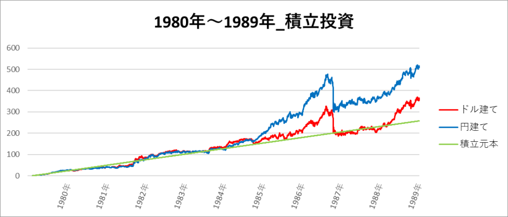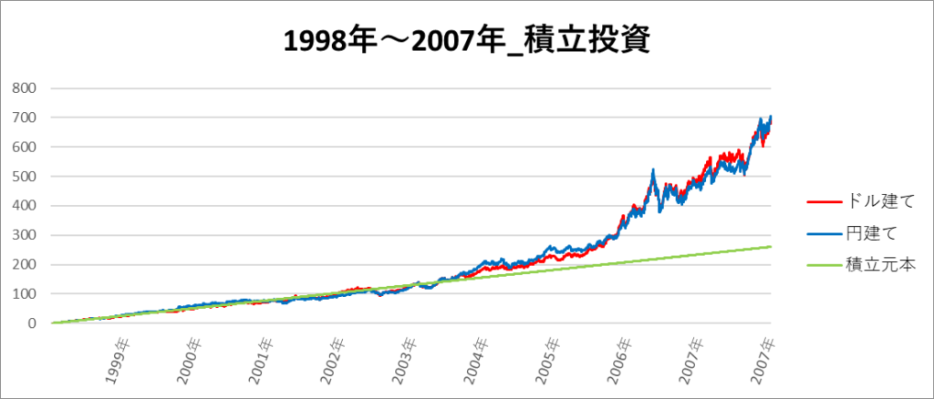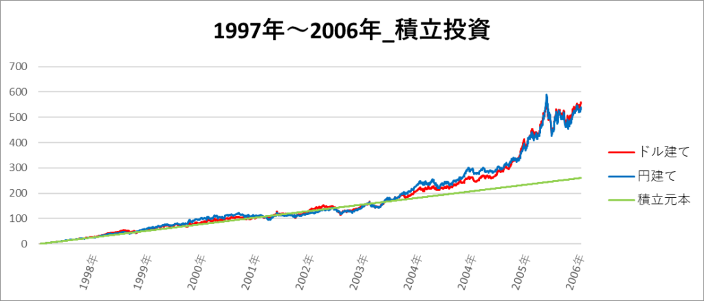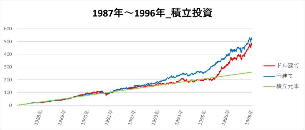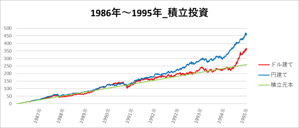 円建てとドル建ての2パターンを比較できるようにグラフに表記しているので、見比べて見てください。