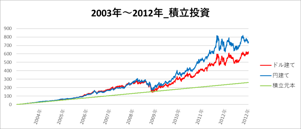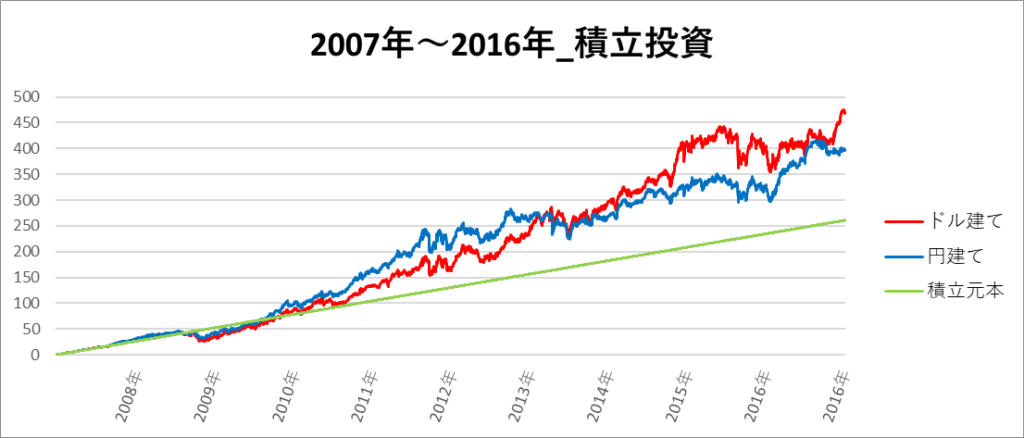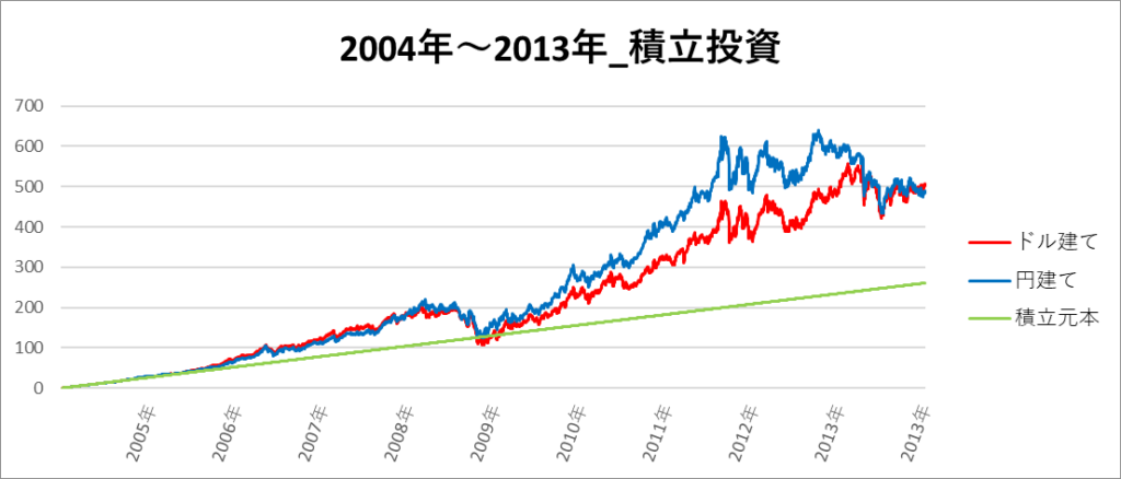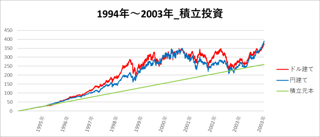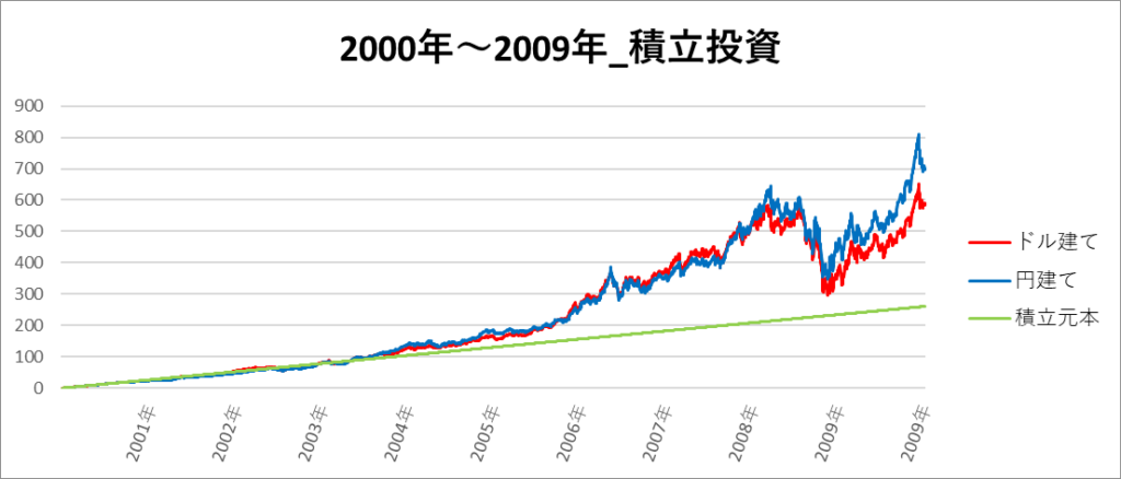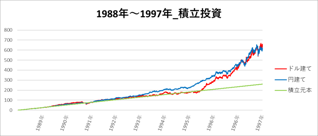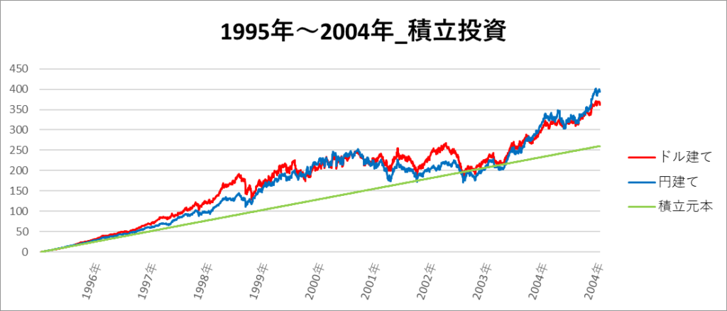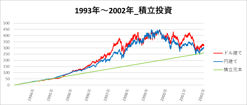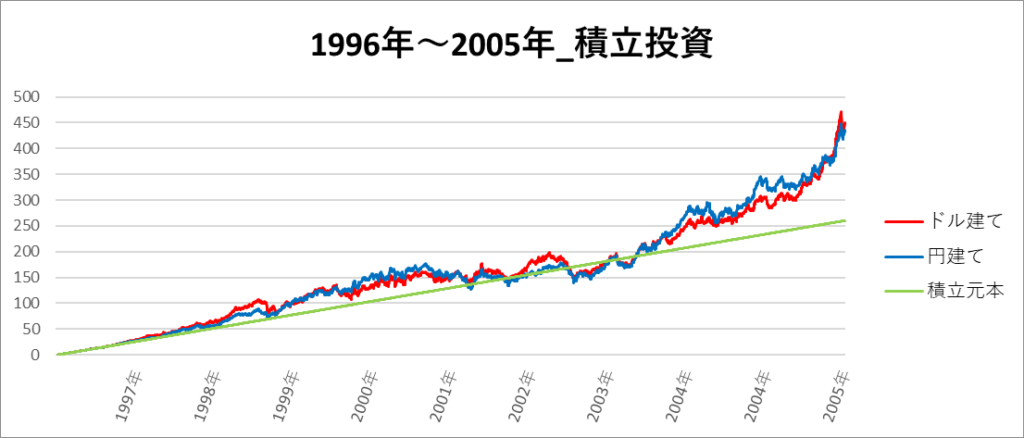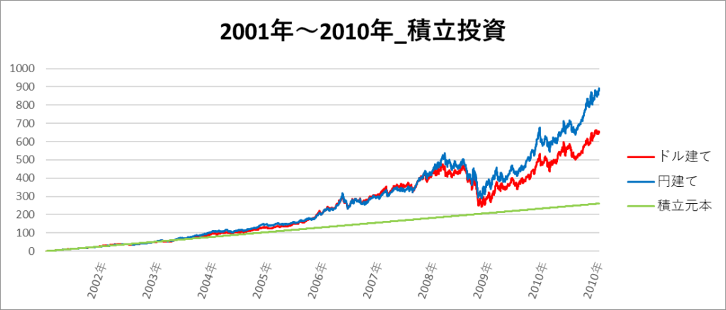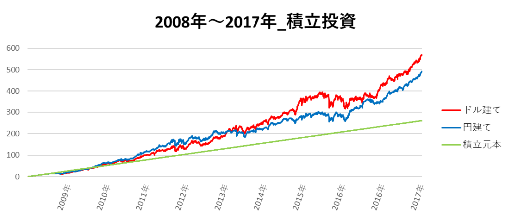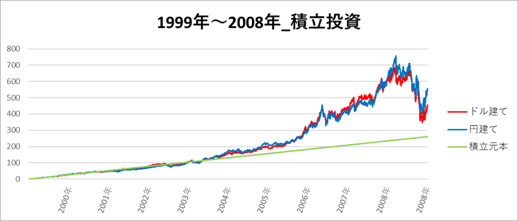 円建てとドル建ての2パターンを比較できるようにグラフに表記しているので、見比べて見てください。