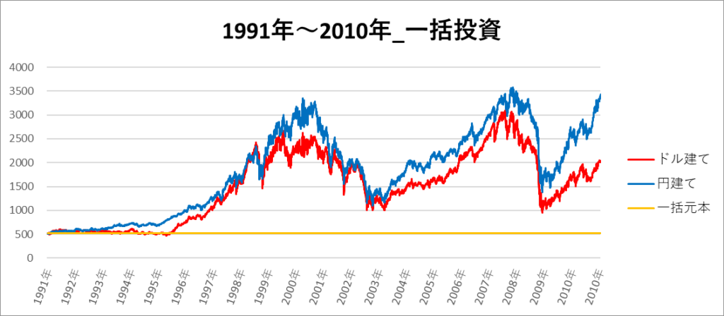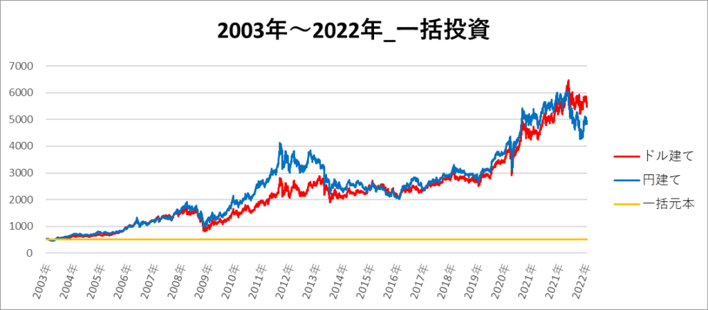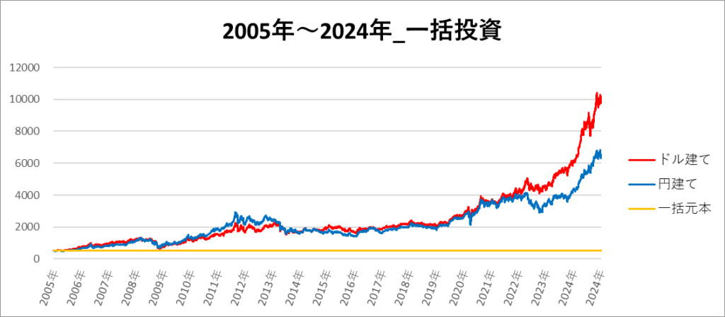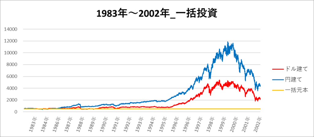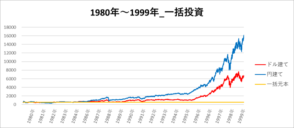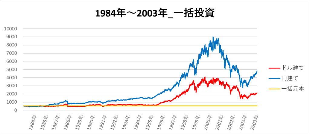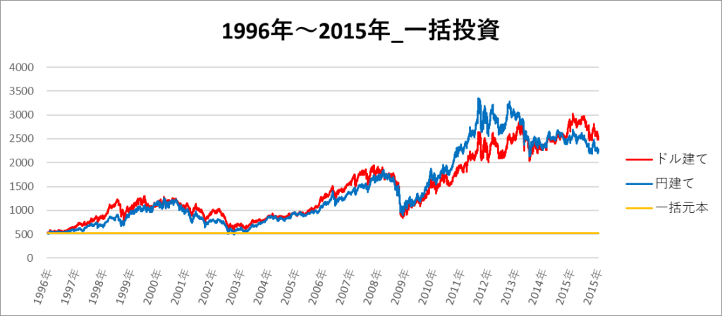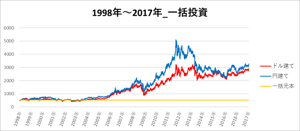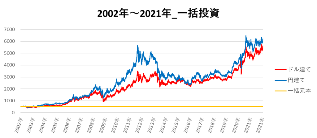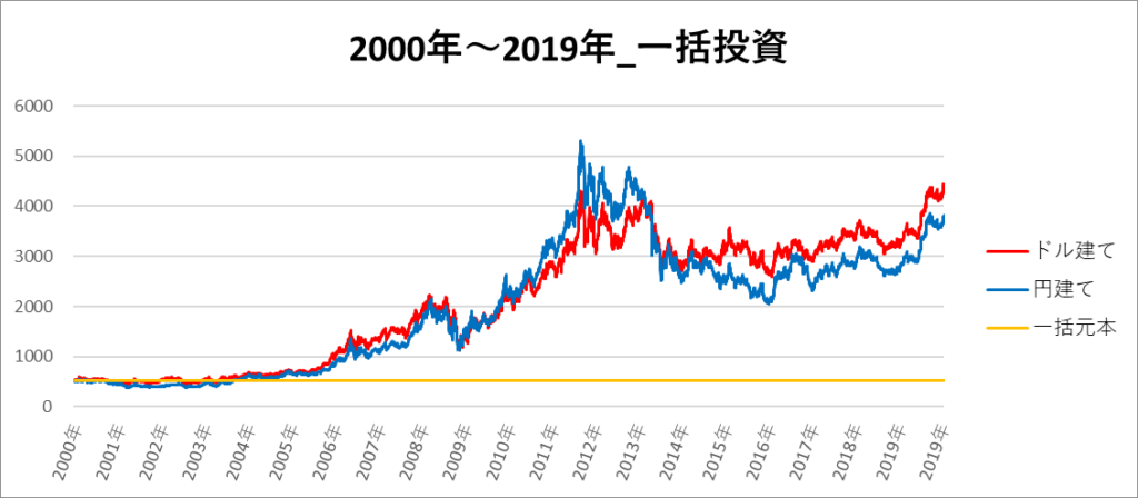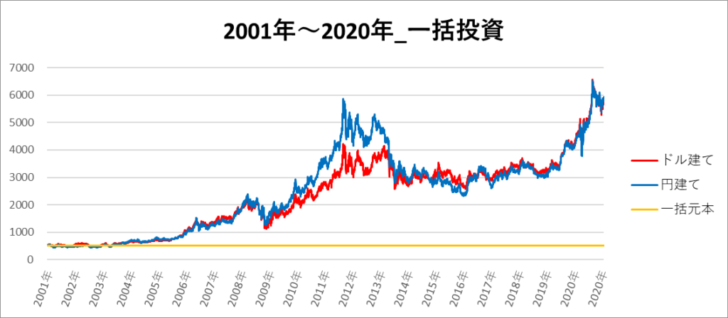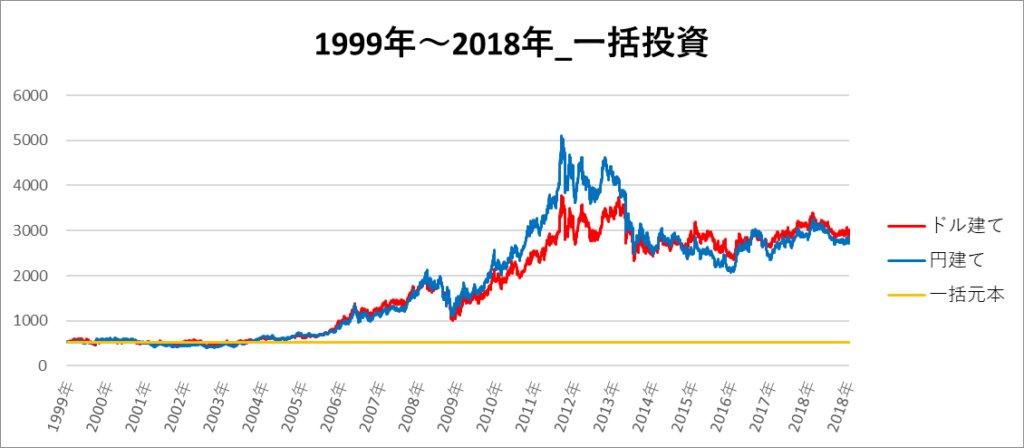 円建てとドル建ての2パターンを比較できるようにグラフに表記しているので、見比べて見てください。