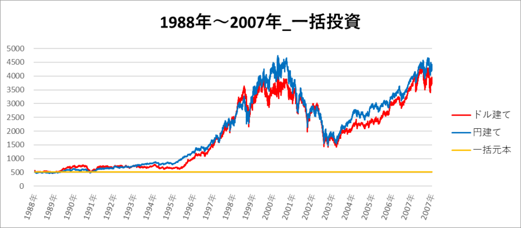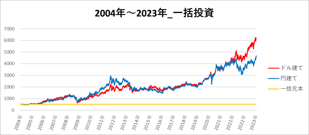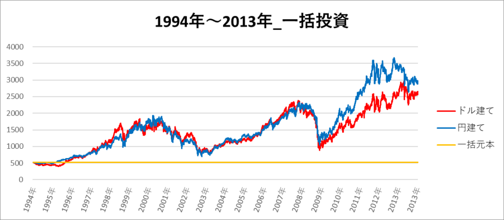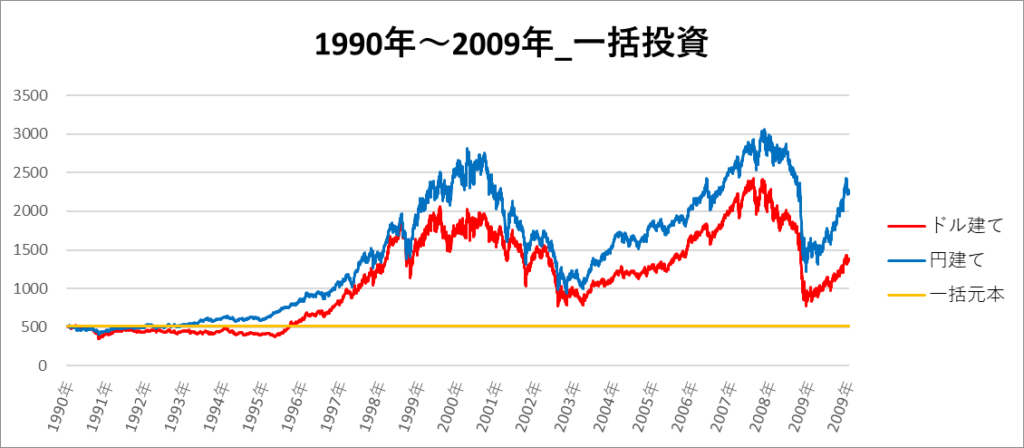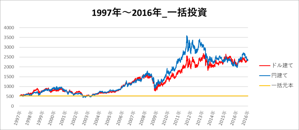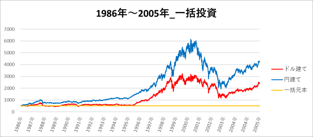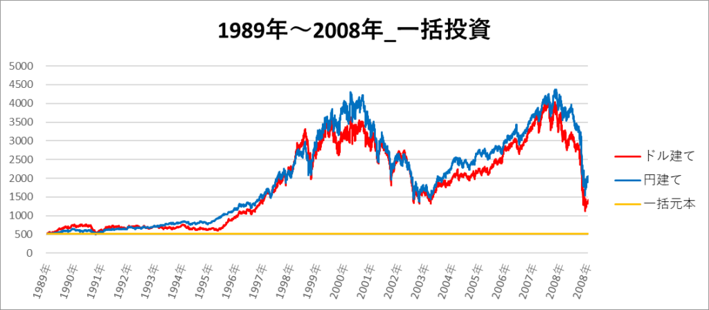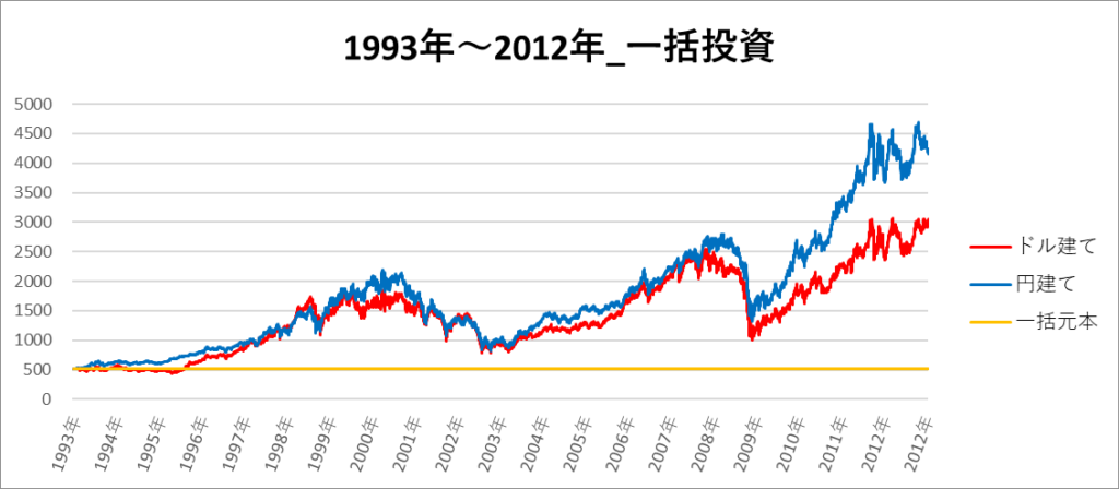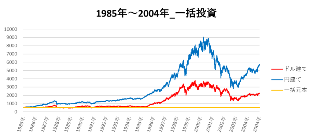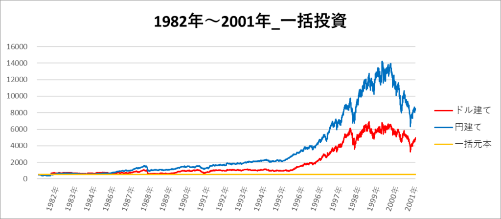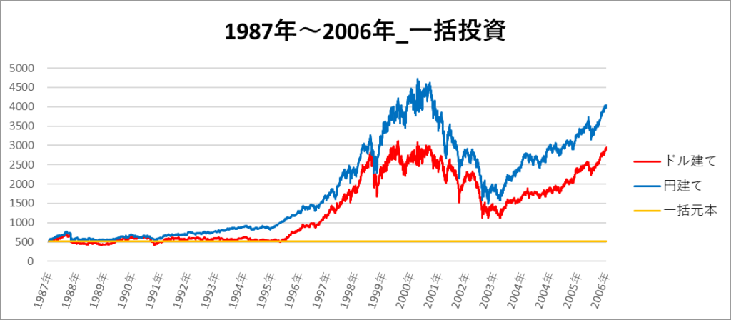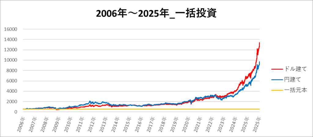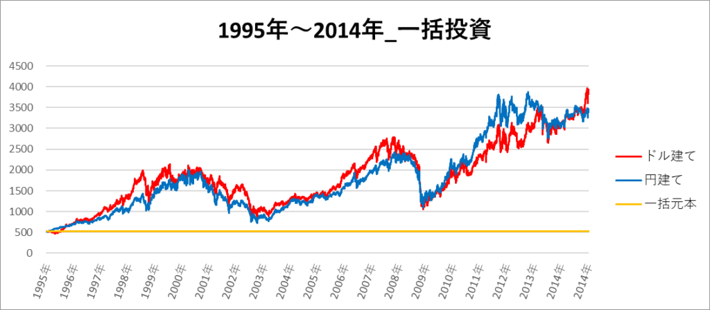 円建てとドル建ての2パターンを比較できるようにグラフに表記しているので、見比べて見てください。