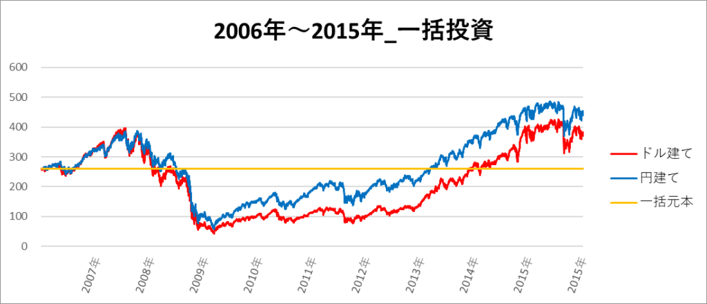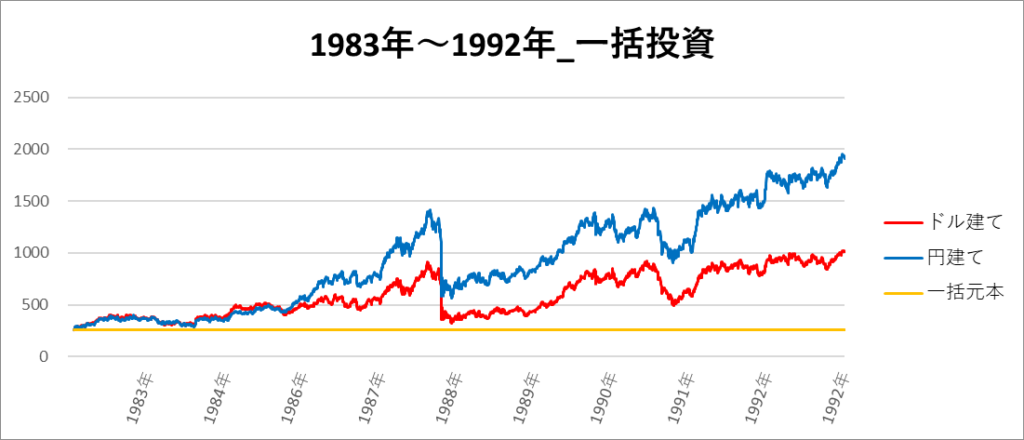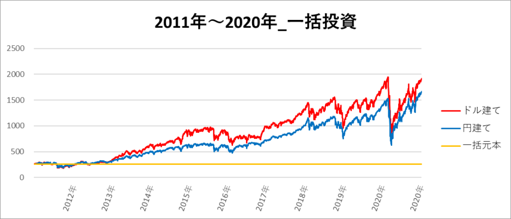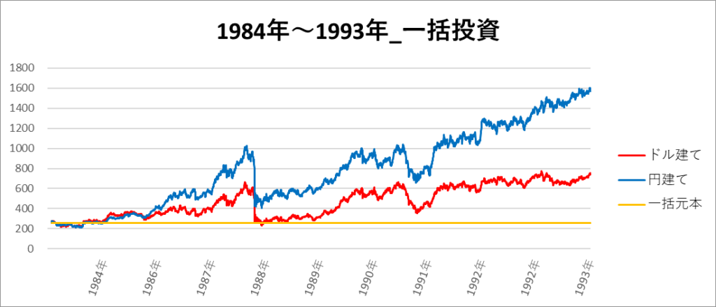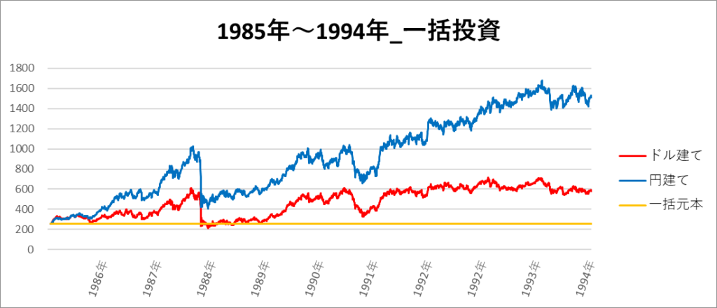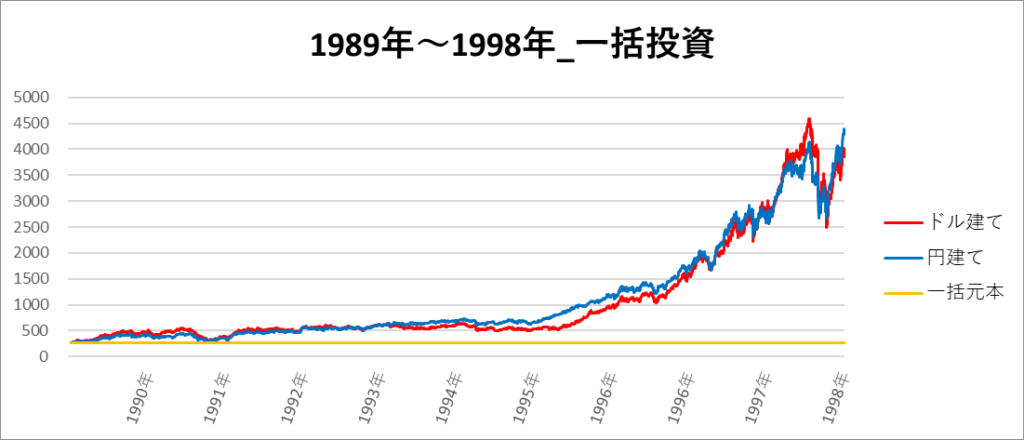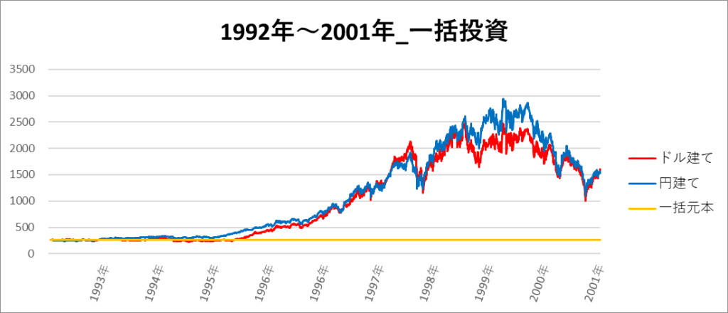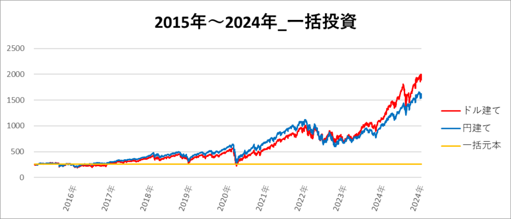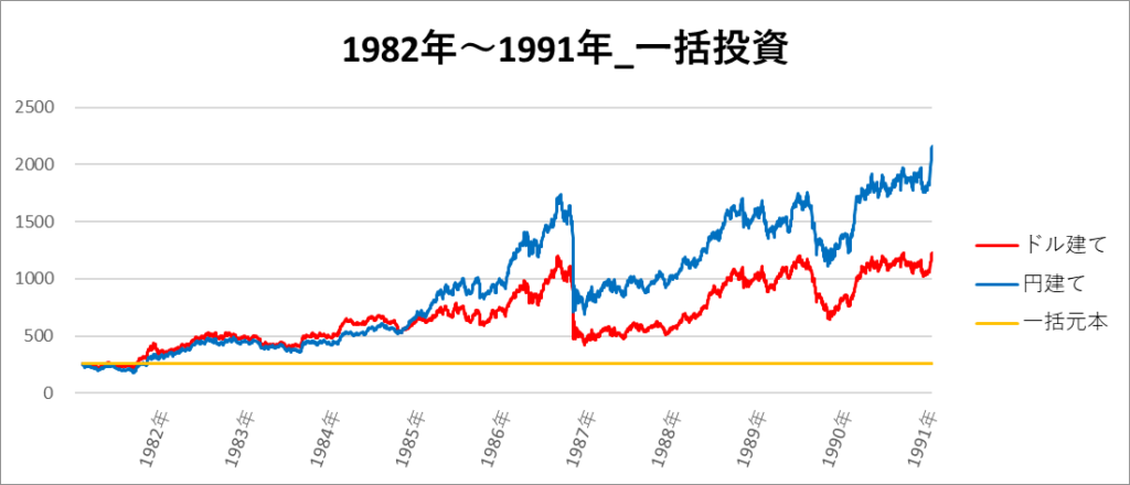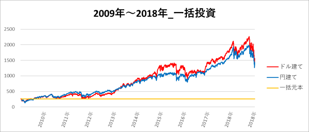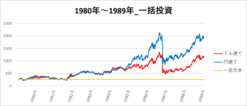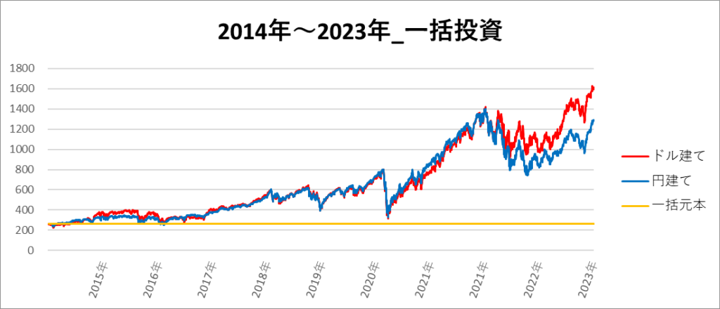円建てとドル建ての2パターンを比較できるようにグラフに表記しているので、見比べて見てください。