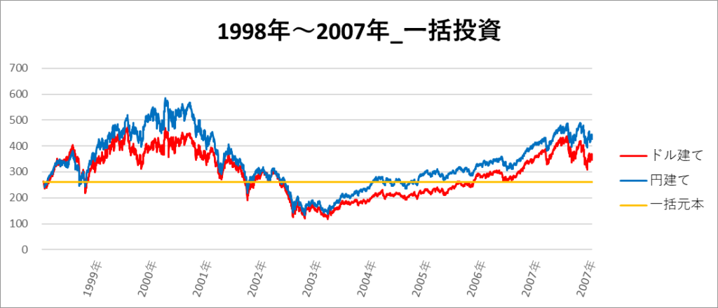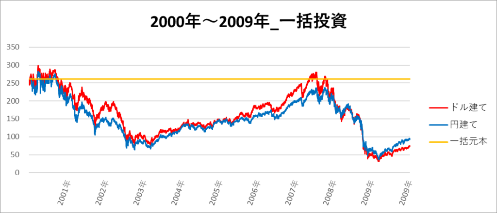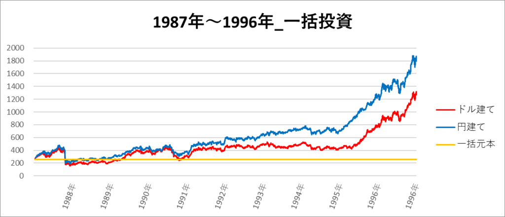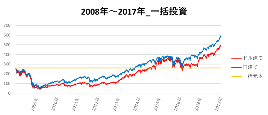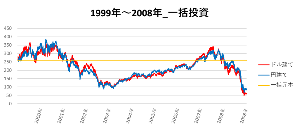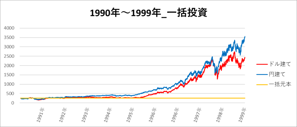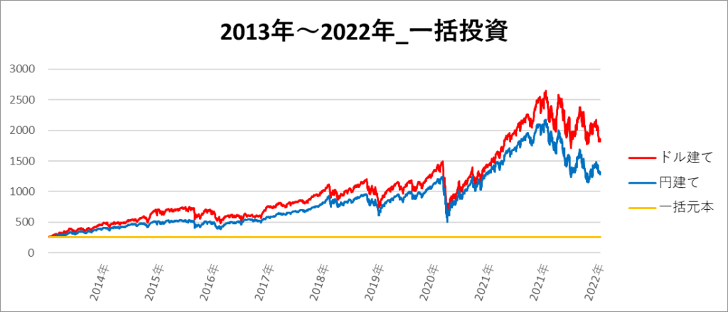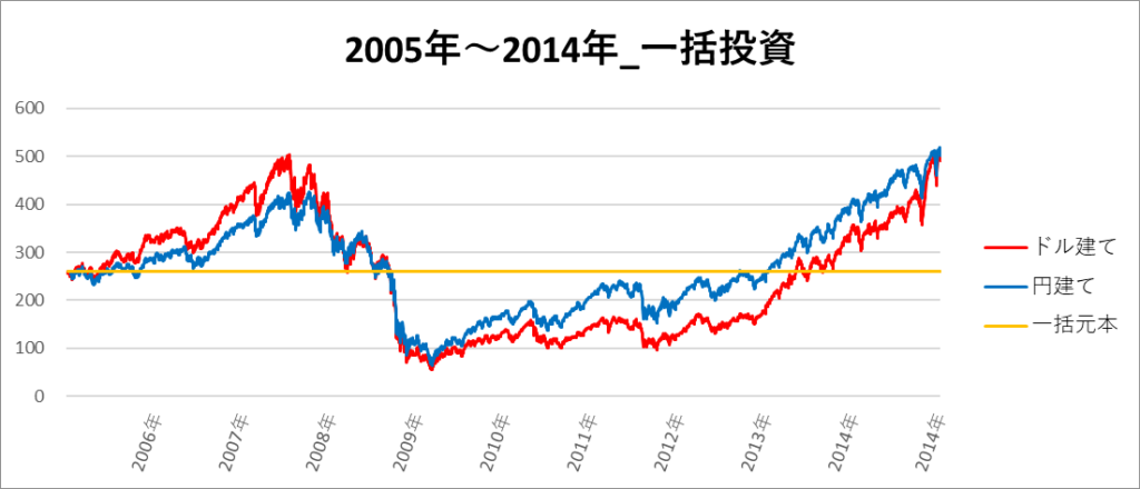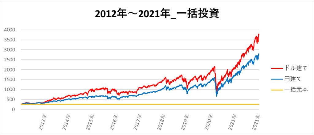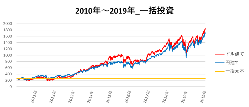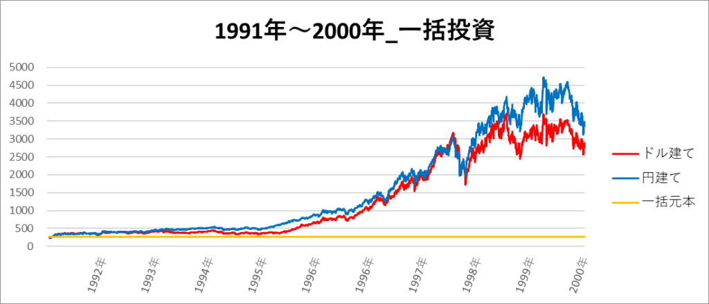 円建てとドル建ての2パターンを比較できるようにグラフに表記しているので、見比べて見てください。