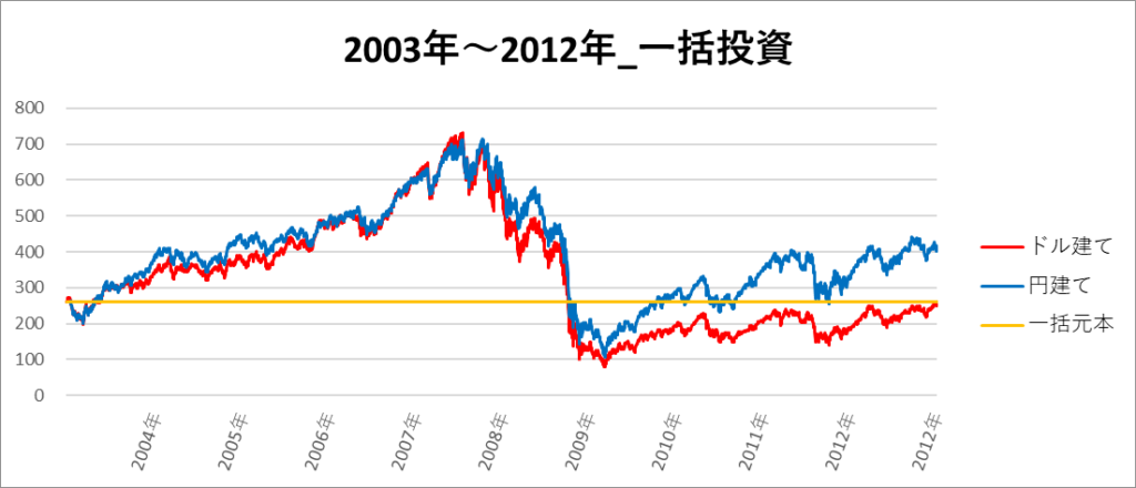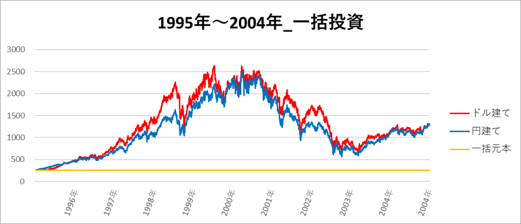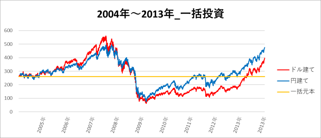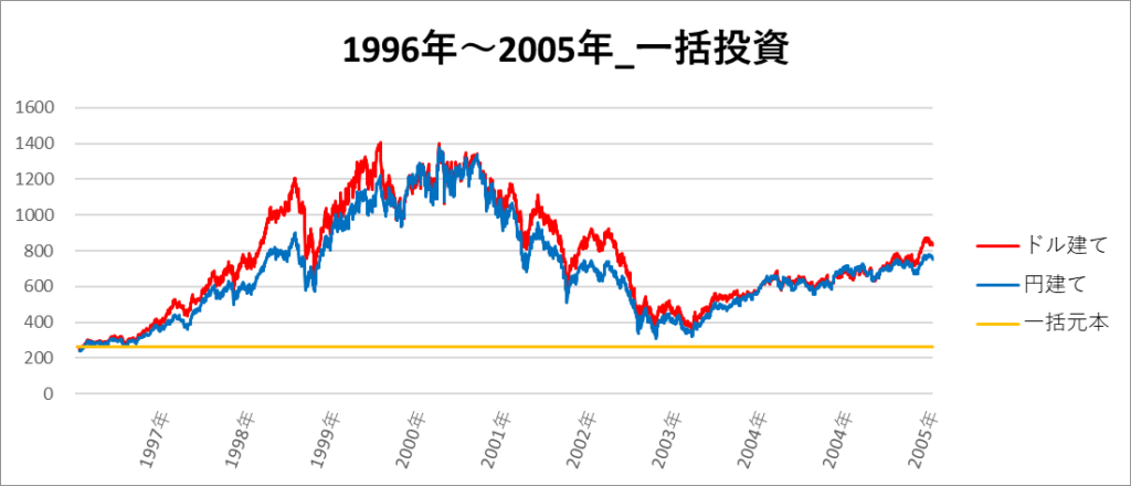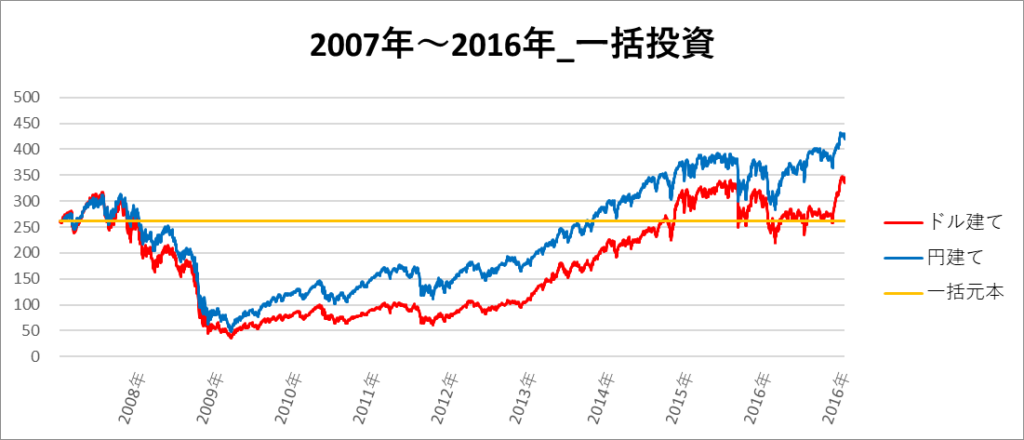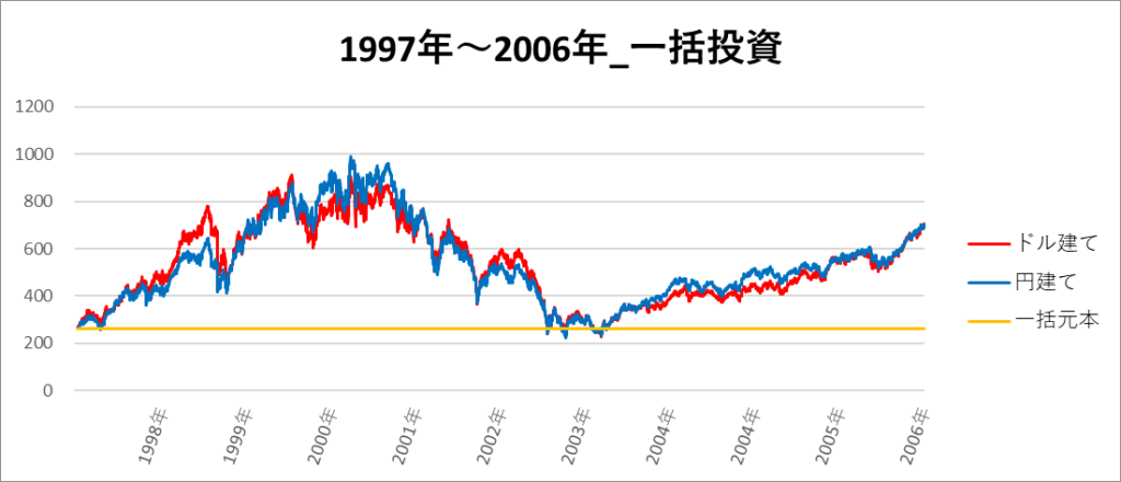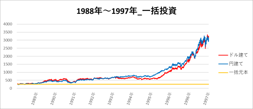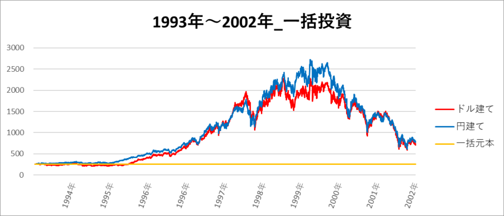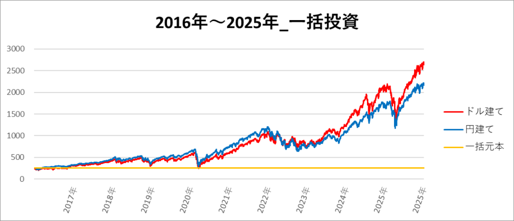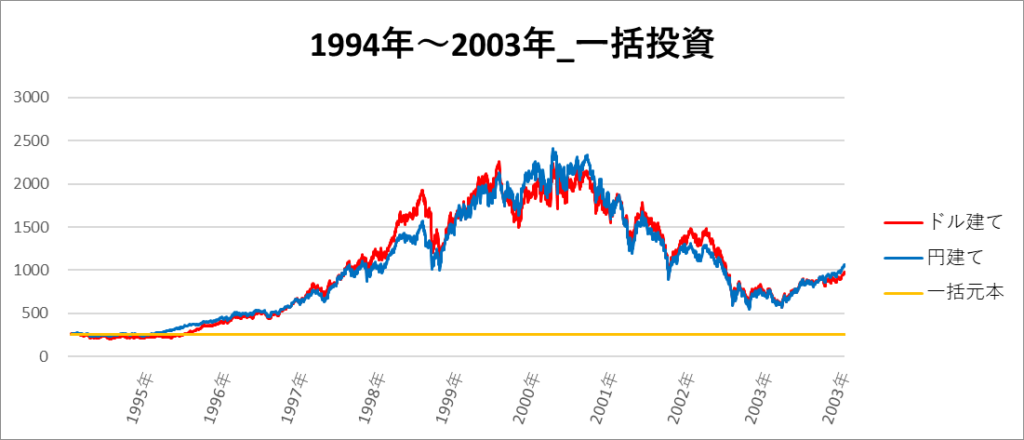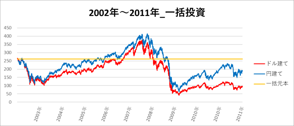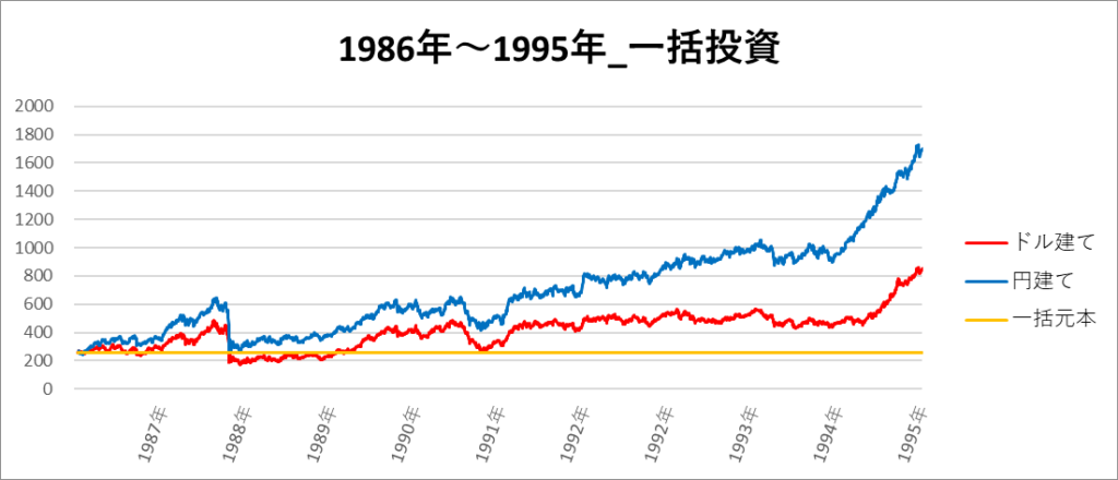 円建てとドル建ての2パターンを比較できるようにグラフに表記しているので、見比べて見てください。