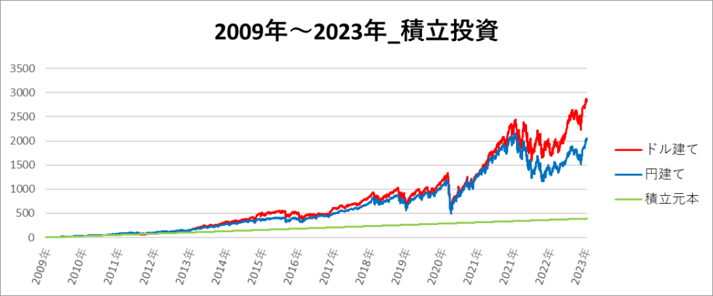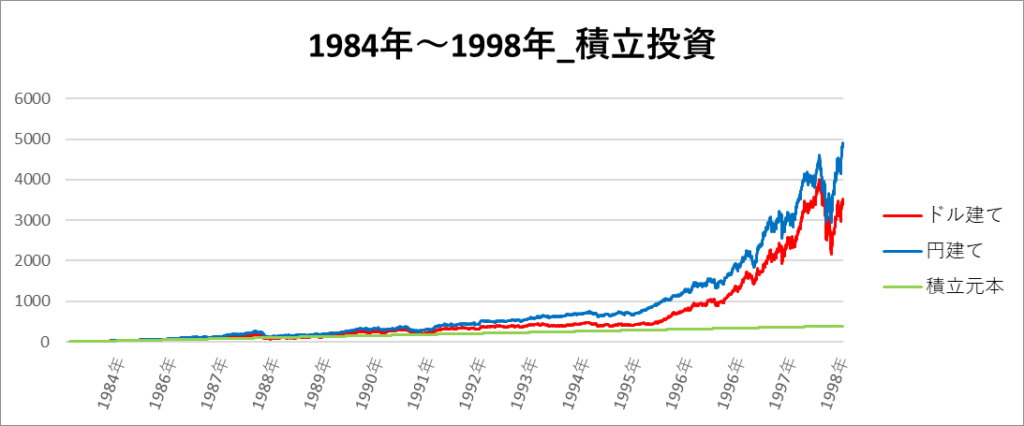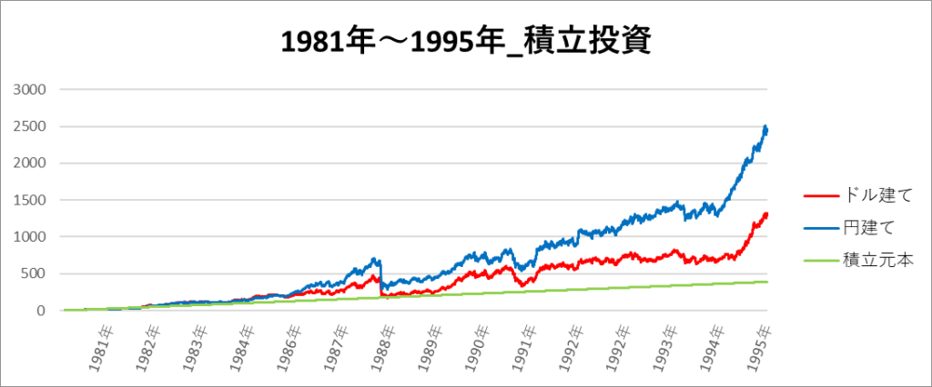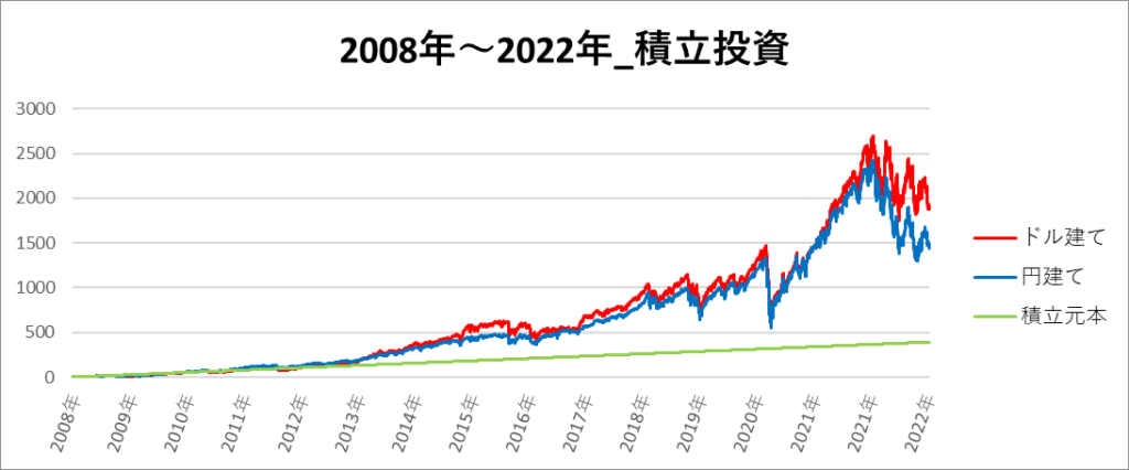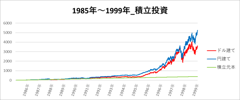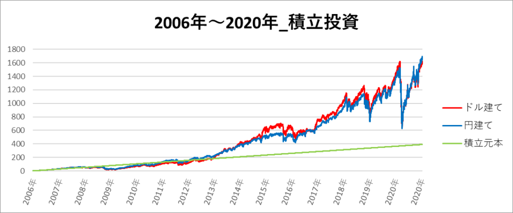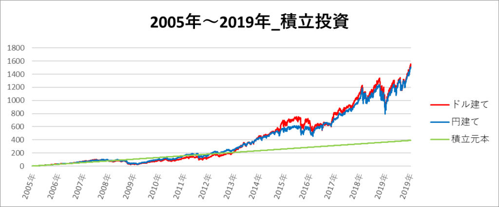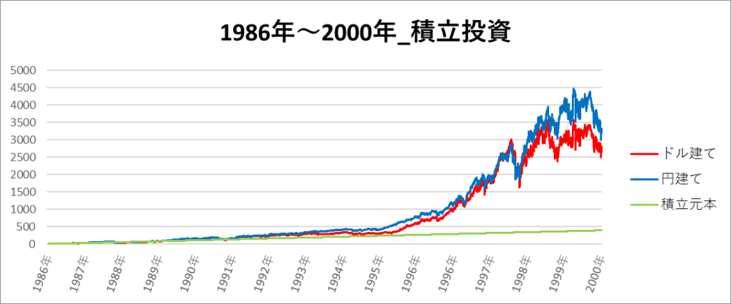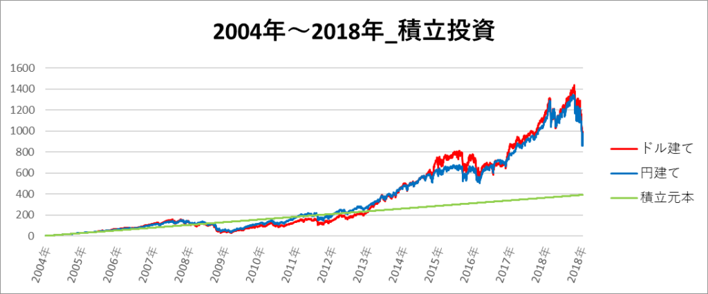 円建てとドル建ての2パターンを比較できるようにグラフに表記しているので、見比べて見てください。