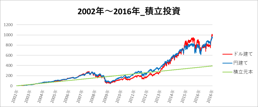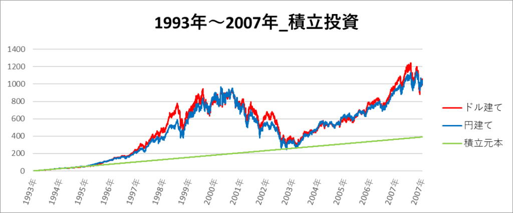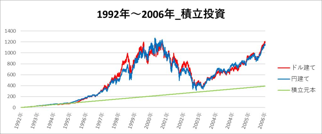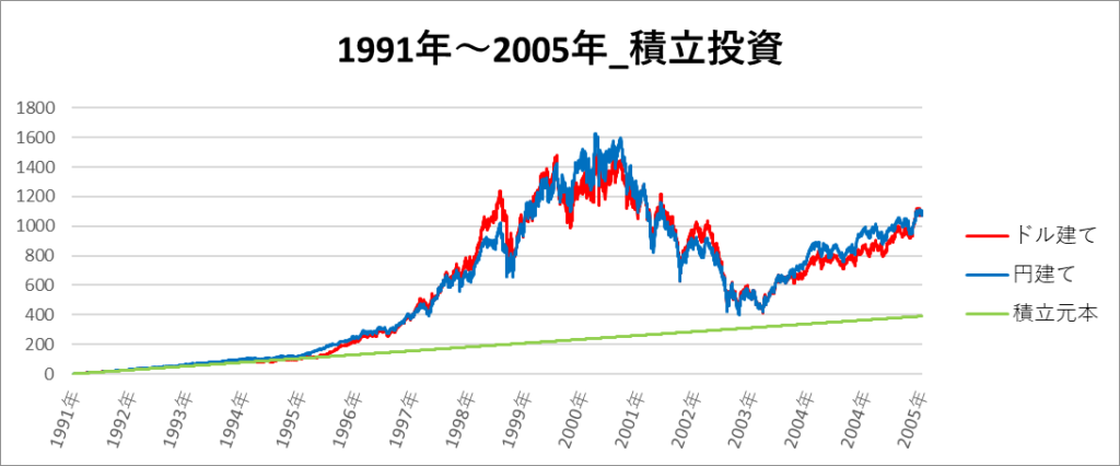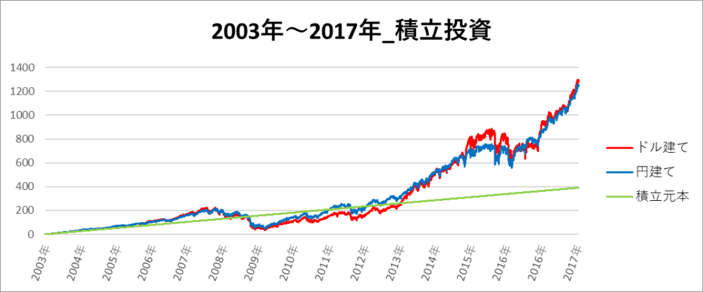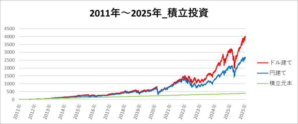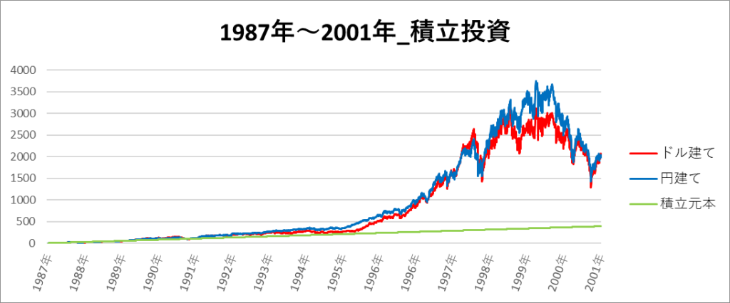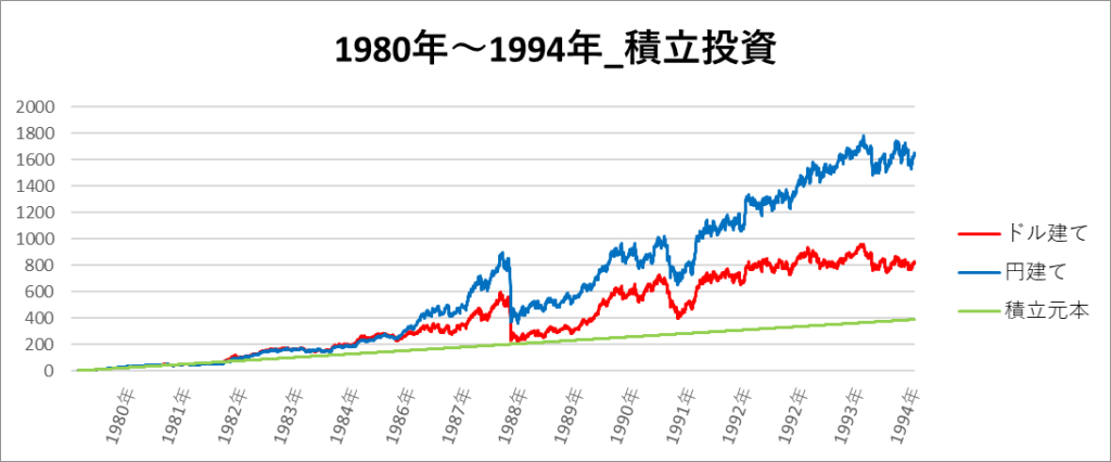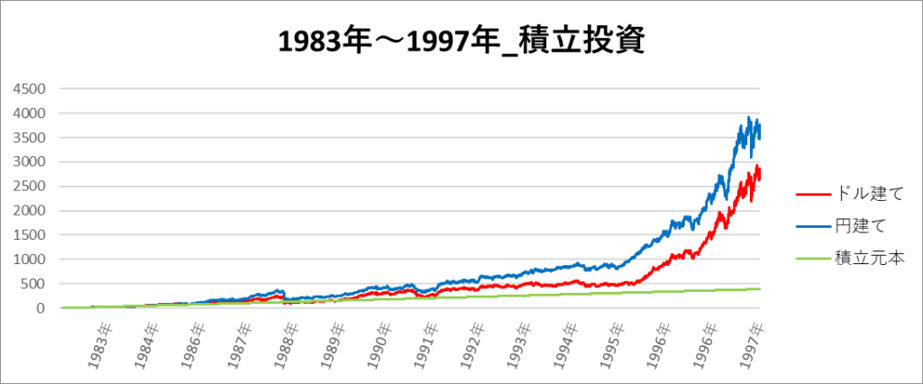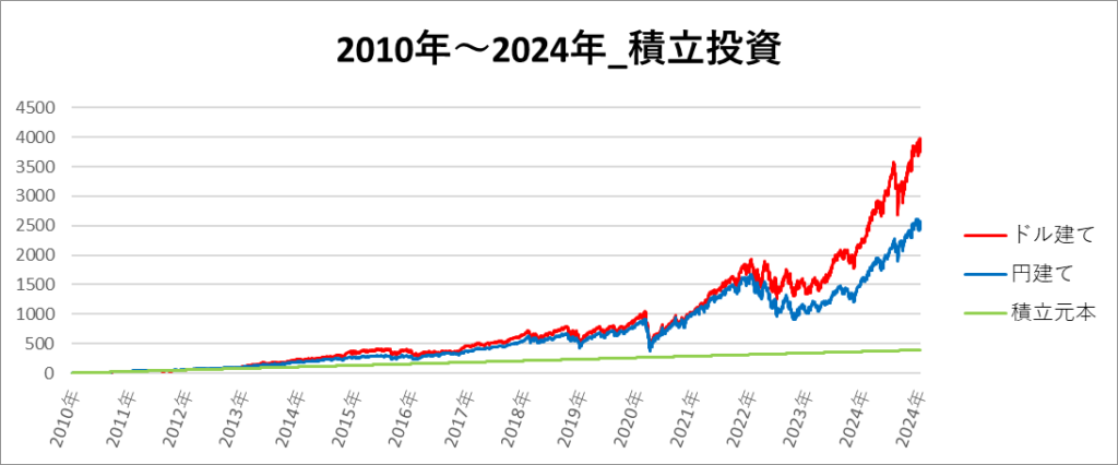 円建てとドル建ての2パターンを比較できるようにグラフに表記しているので、見比べて見てください。