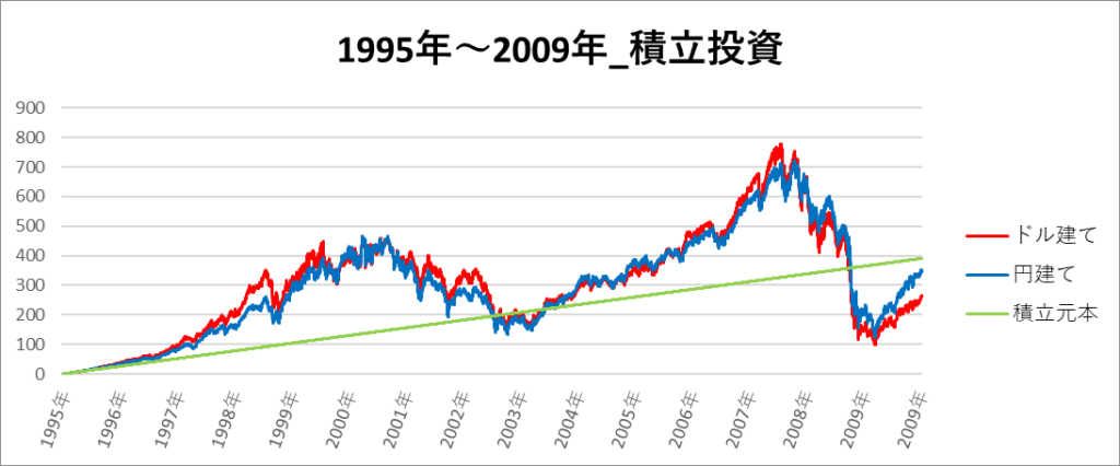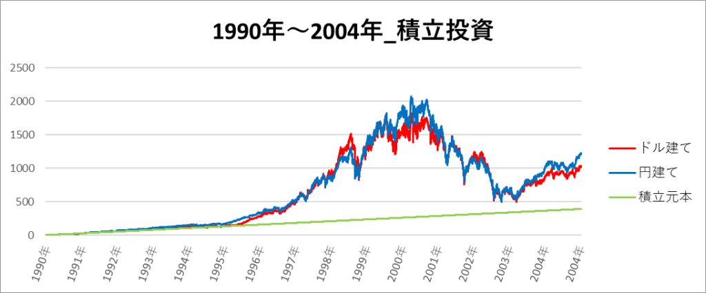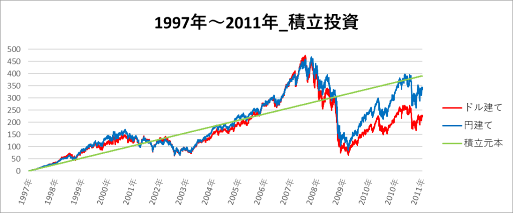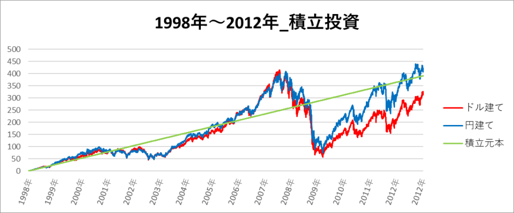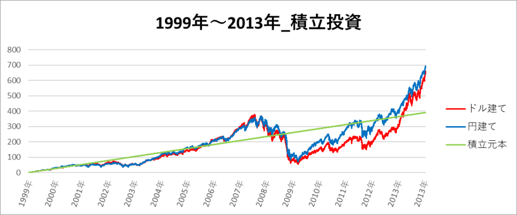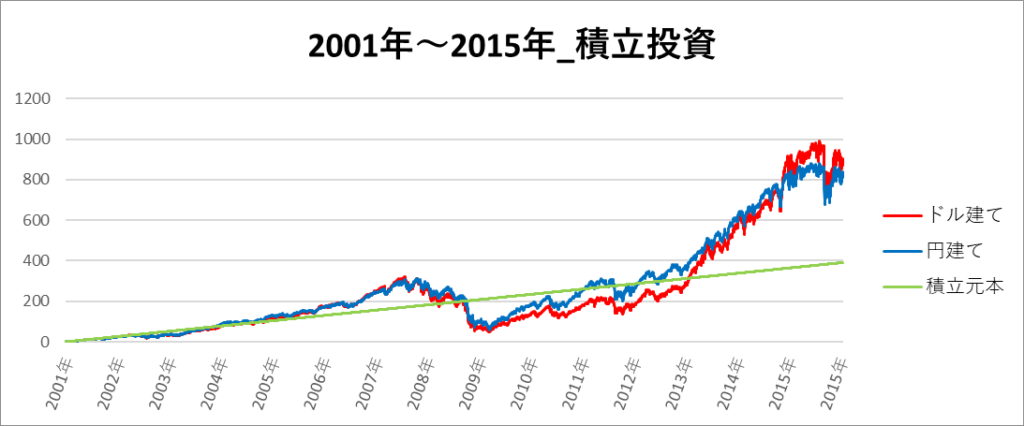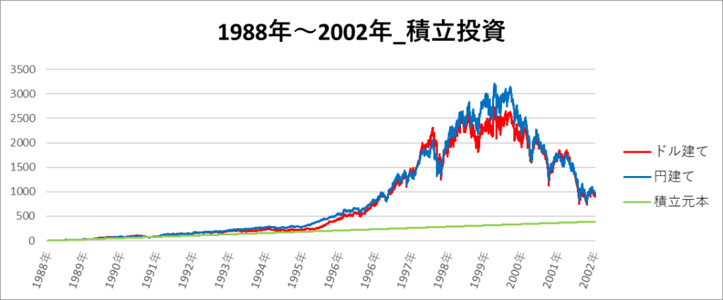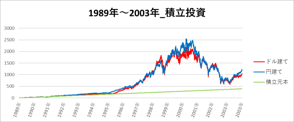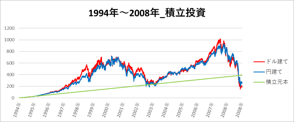 円建てとドル建ての2パターンを比較できるようにグラフに表記しているので、見比べて見てください。