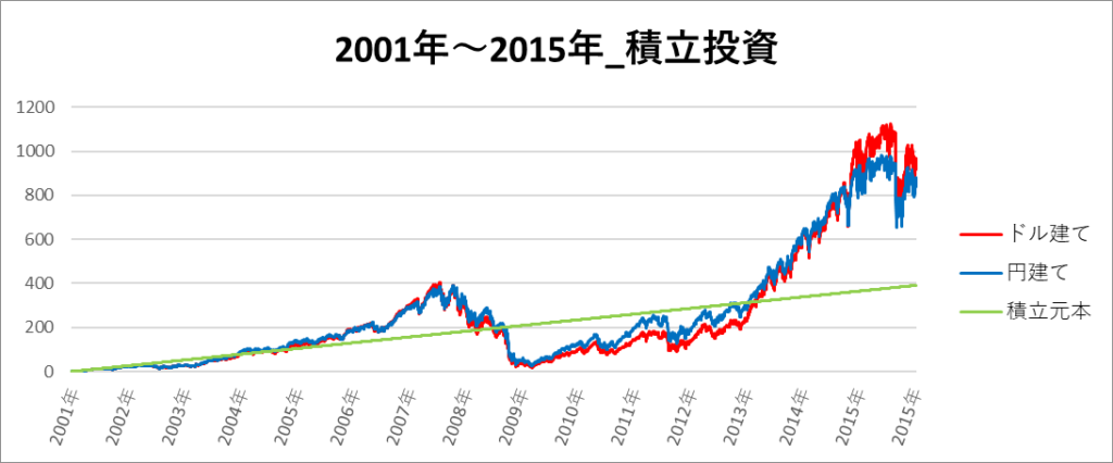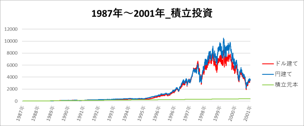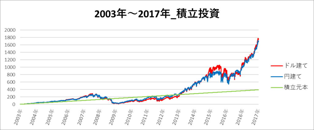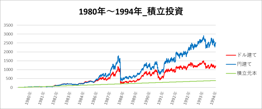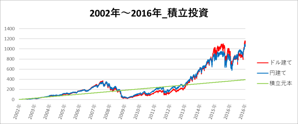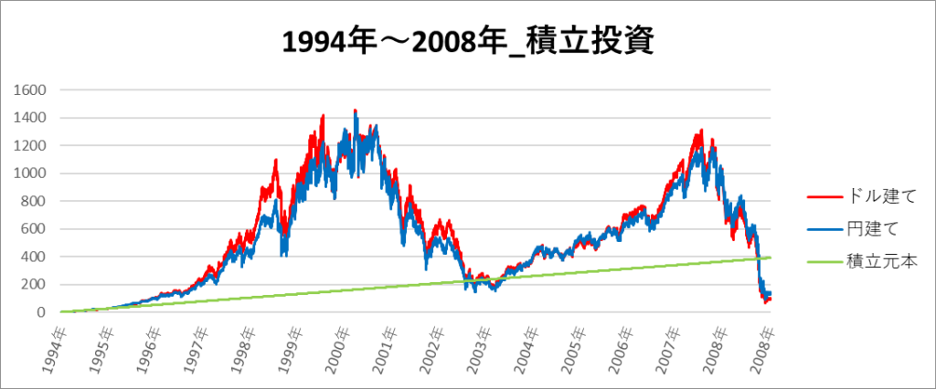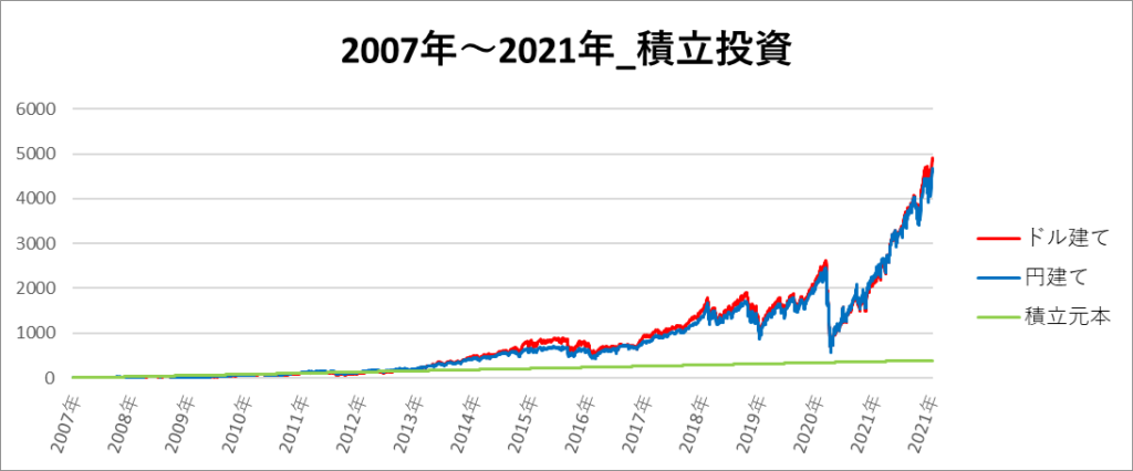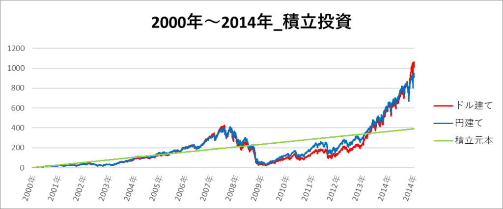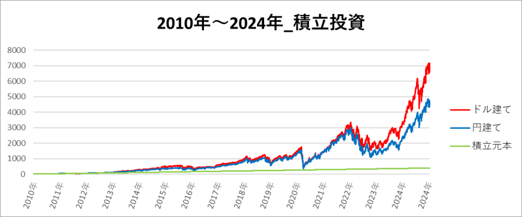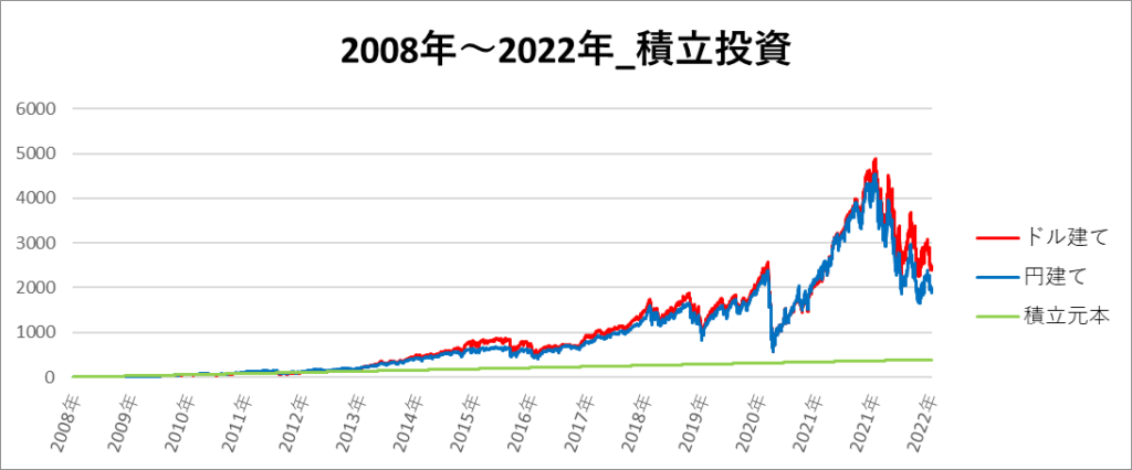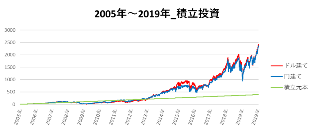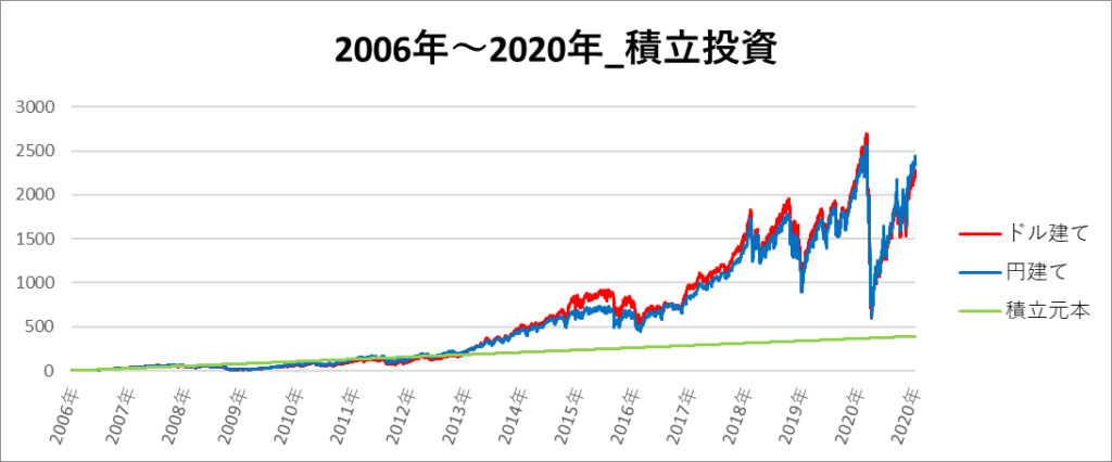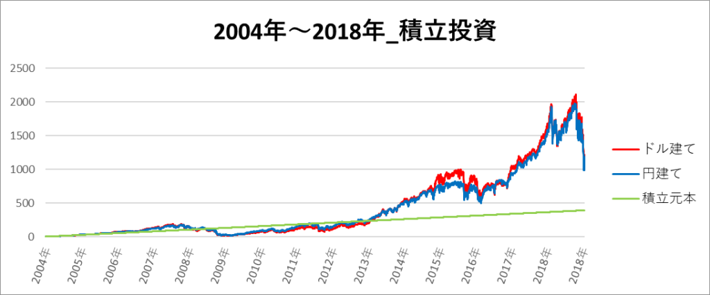 円建てとドル建ての2パターンを比較できるようにグラフに表記しているので、見比べて見てください。