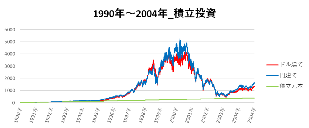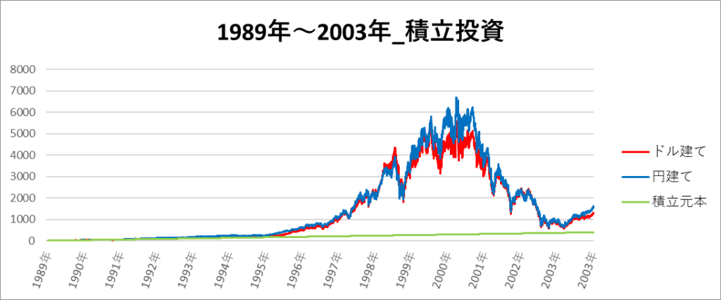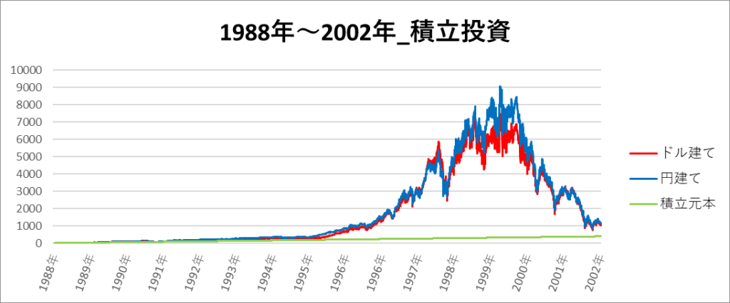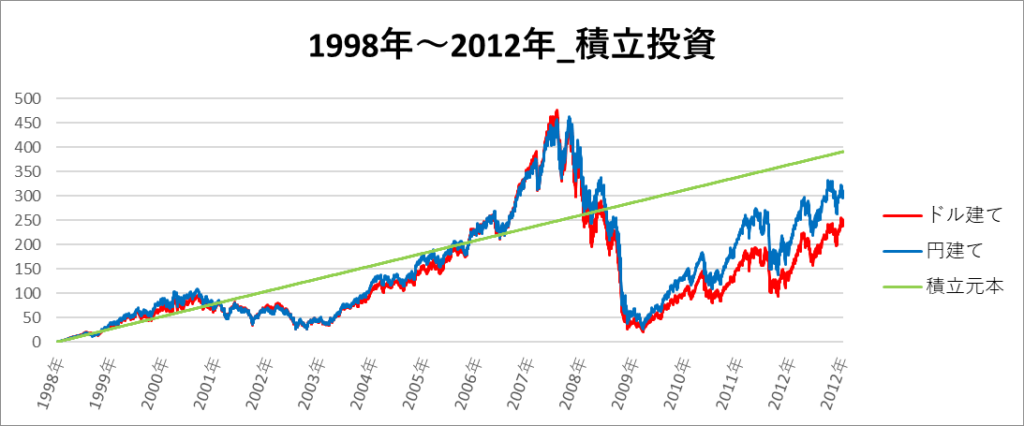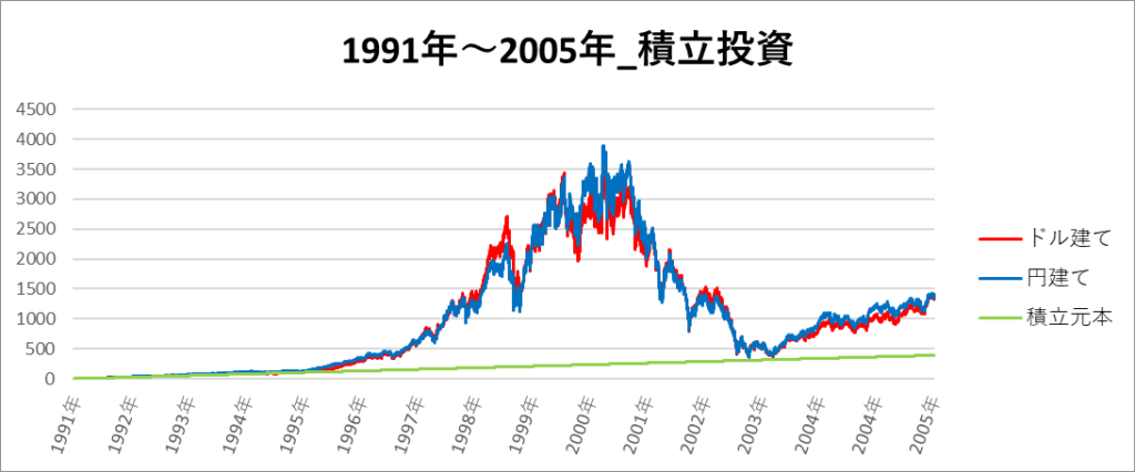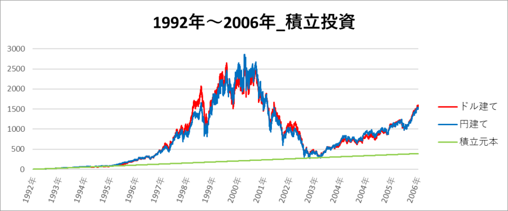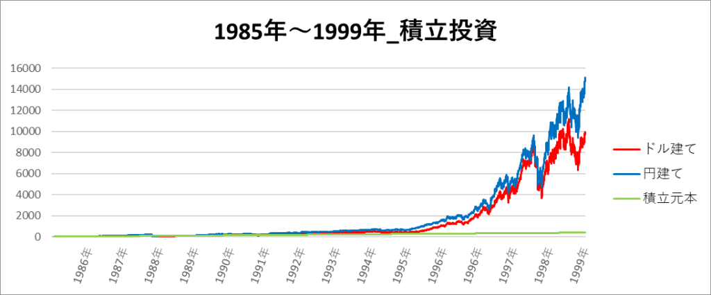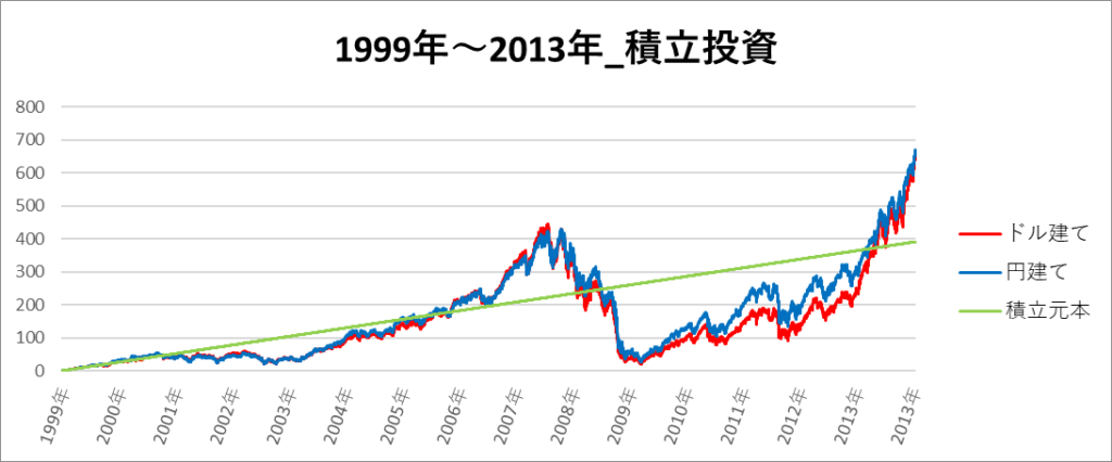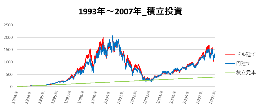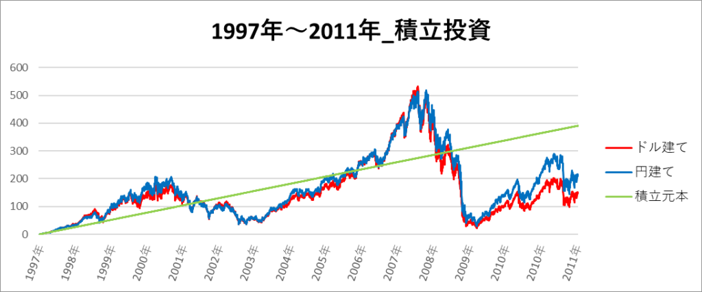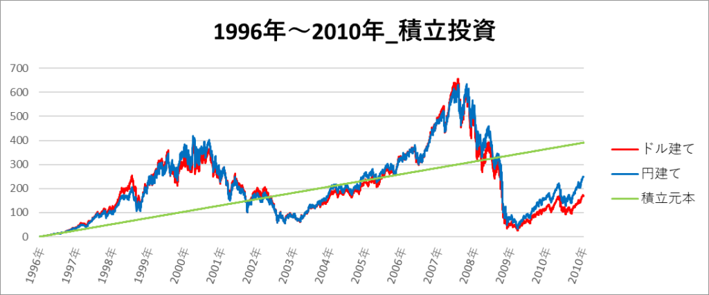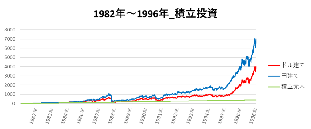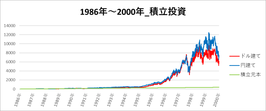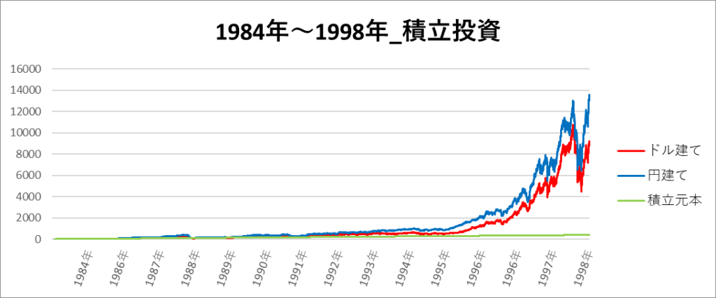 円建てとドル建ての2パターンを比較できるようにグラフに表記しているので、見比べて見てください。