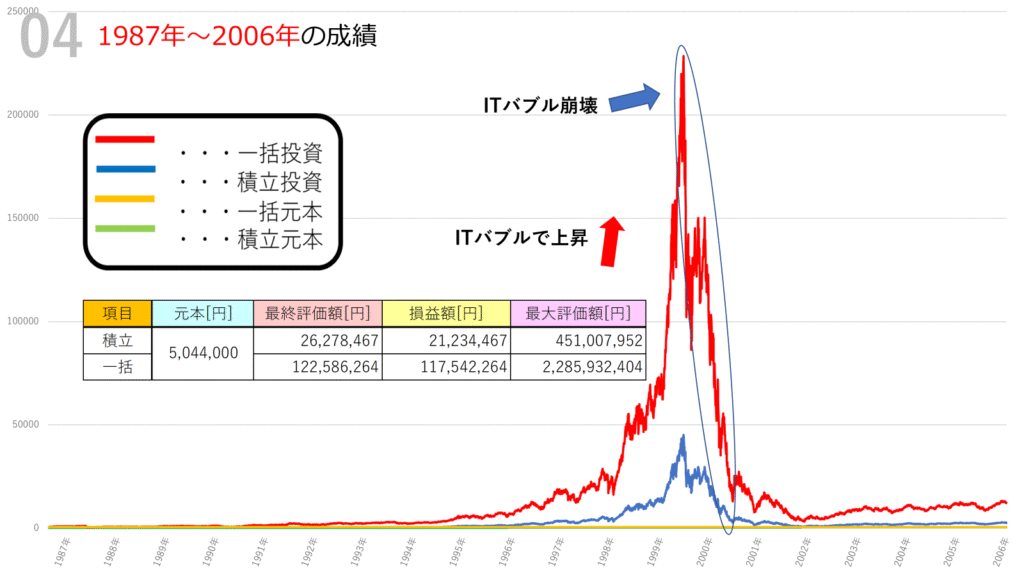 今回は 1987年〜2006年の20年間 を対象に、レバナスに 一括投資と積立投資を行った場合のシミュレーション結果をご紹介します。