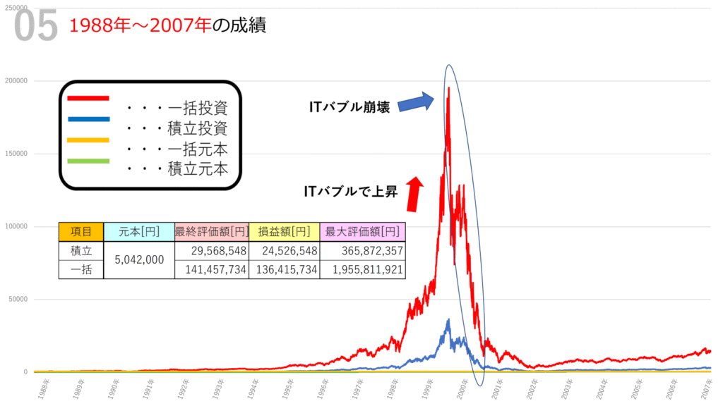 - 一括投資:1988年に約504万2千円を一度に投資(積立なし)