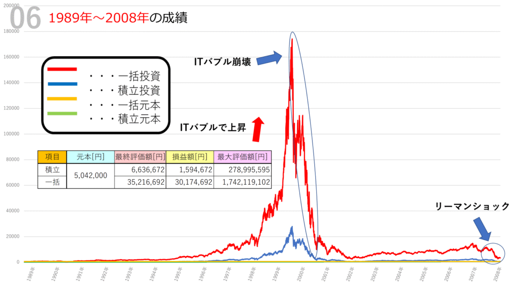 ここでは 1989年〜2008年の20年間 を対象に、一括投資と積立投資をした場合のシミュレーション結果を解説します。