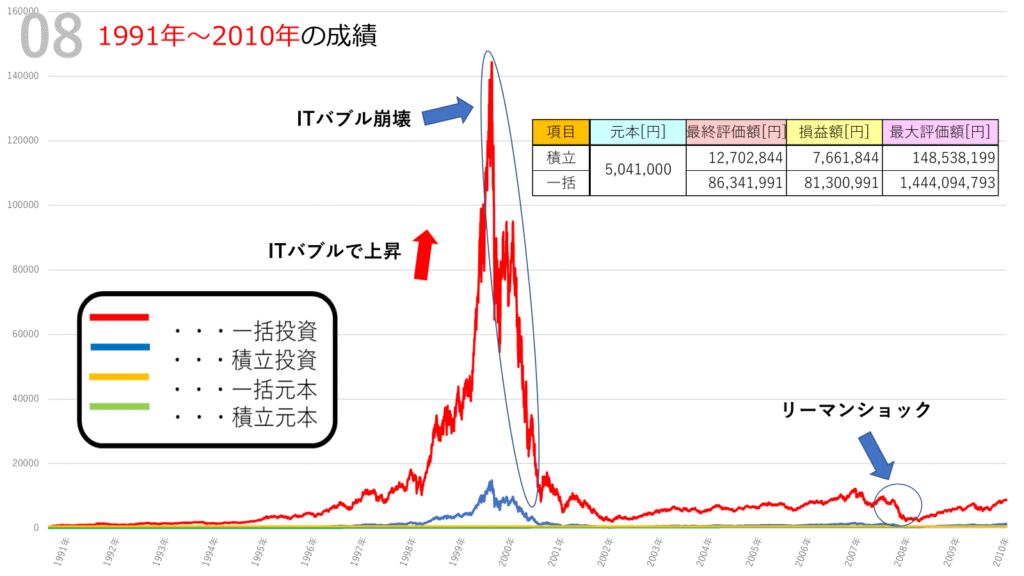 今回は 1991年〜2010年の20年間 を対象に、一括投資と積立投資を行った場合のシミュレーション結果を解説します。