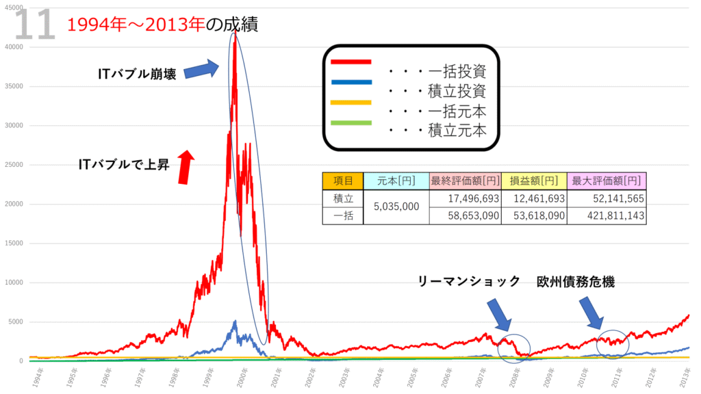 - 一括投資:1994年に約503万5千円を一度に投資(積立なし)