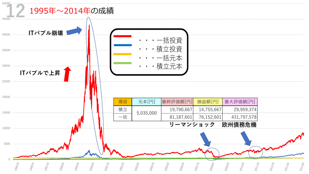 - 一括投資:1995年に約503万5千円をまとめて投資(積立なし)