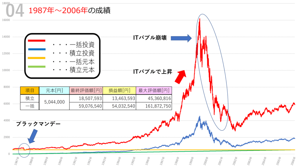 1987年~2006年という激動の20年間では、一括投資の爆発力が際立つ結果となりました。最大評価額1.6億円超という数字は、まさに「夢のあるリターン」です。一方で、その過程では何度も大きな下落を経験し、資産が大きく減るリスクもありました。