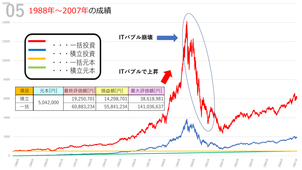 1988年から2007年という時期は、まさに「ハイテクバブル」の象徴でした。一括投資の爆発力が強烈に表れています。しかし同時に、途中の暴落で大きなリスクを背負うことにもなります。