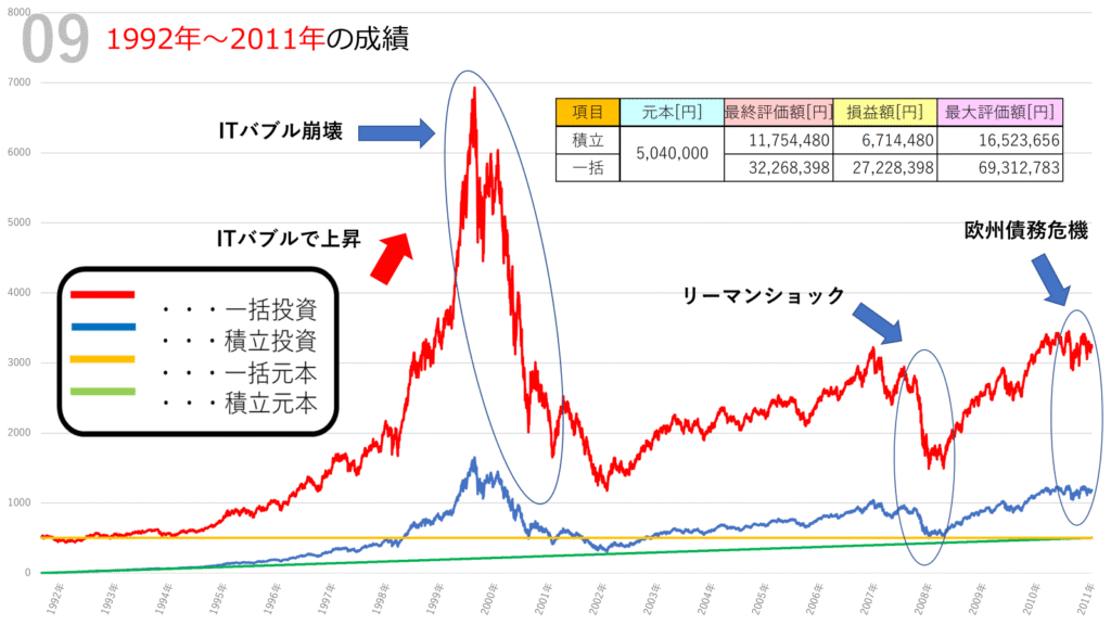 1992年から2011年という歴史的に大きなイベントが多い時期を振り返ると、どちらの投資方法にも明確なメリットとデメリットがあることが分かります。