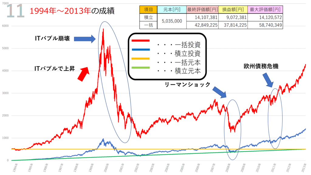 NASDAQ100 一括投資 vs 積立投資|20年間のチャートシミュレーション(1994~2013年)