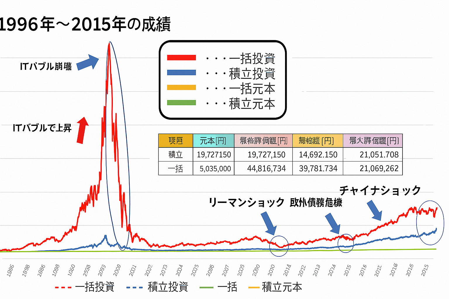 • 一括投資は大きなリターンをもたらすが、暴落に耐えられるかが鍵。