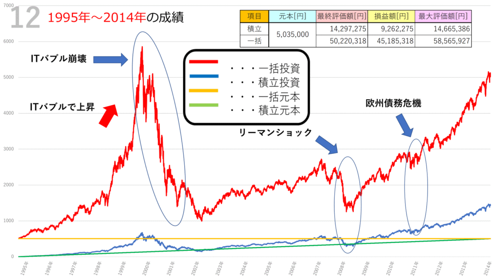 1995年から2014年の20年間、NASDAQ100に投資した場合のシミュレーションは、一括投資と積立投資で大きな違いを見せました。