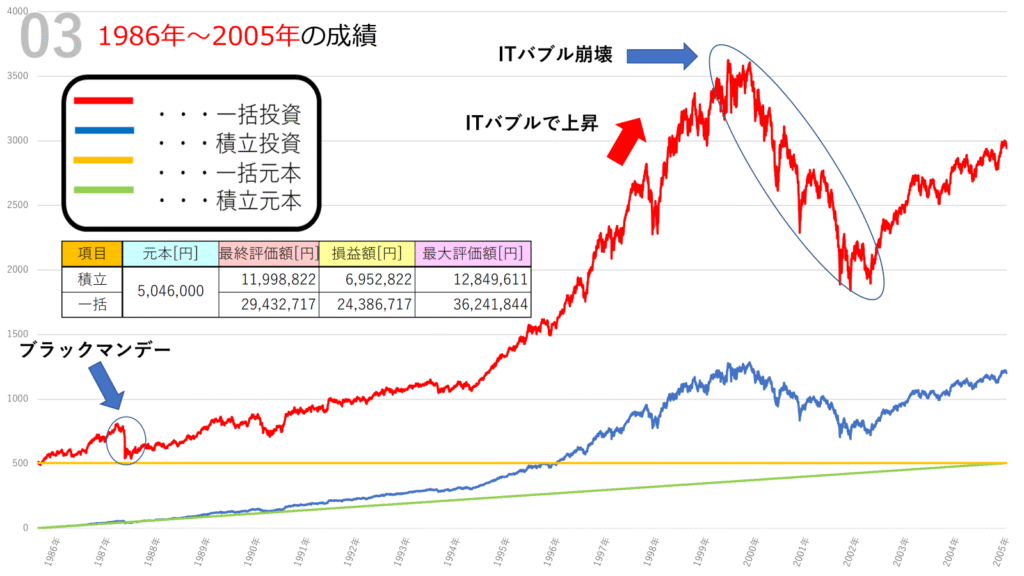 このシミュレーションからわかるように、一括投資は「早く投資を始めた分、複利の効果を最大限に享受できる」という強みがあります。1986年からの長期上昇トレンドを背景に、資産は20年で約6倍に成長しました。