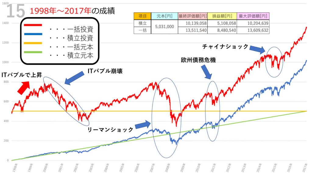 投資の世界では「一括投資」と「積立投資」のどちらが有利かという議論がよく取り上げられます。今回はS&P500に対して1998年から2017年までの20年間を対象にシミュレーションを行い、一括投資と積立投資を比較しました。実際の値動きを反映したデータをもとにしたため、当時の大きな経済イベントによる影響もしっかり見えてきます。初心者の方にもわかりやすいように、チャートの上昇・下落を丁寧に解説していきます。