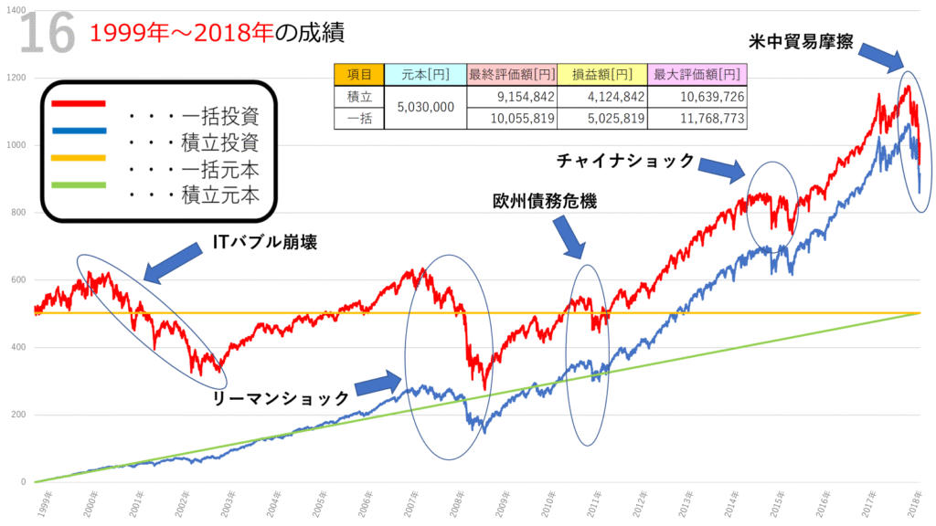 S&P500 一括投資 vs 積立投資|20年間のチャートシミュレーション(1999~2018年)