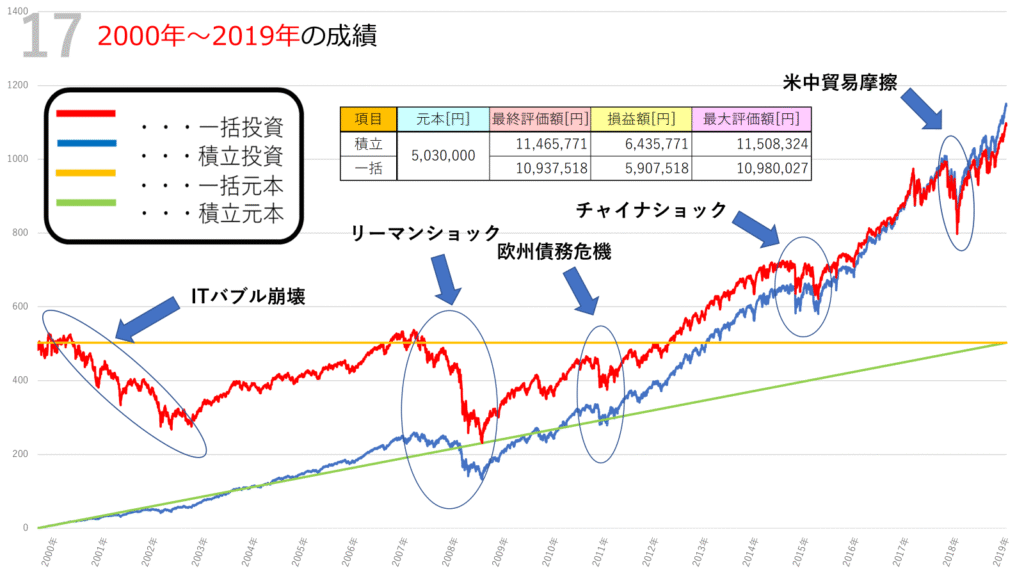 暴落時も安値で買い続けられるため、長期的に見れば安定的な成果を上げやすいのが特徴です。特に今回の2000〜2019年のように、相場に大きな下落局面が複数あった場合、積立投資の強みが発揮されました。