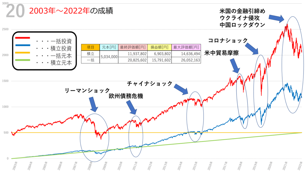 - 投資期間:2003年1月〜2022年12月(20年間)