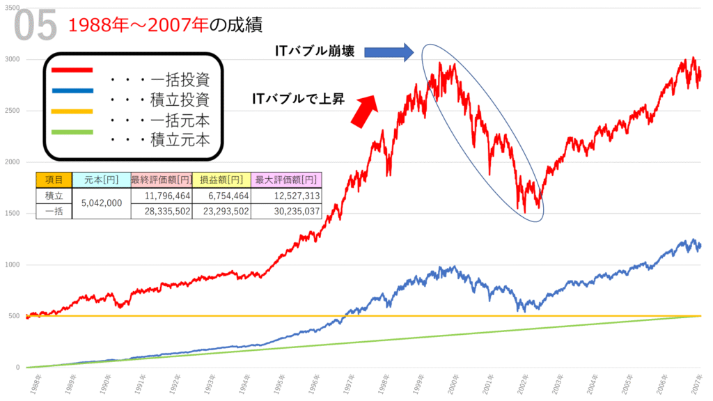 - 1988~2007年の20年間、S&P500に投資した場合、一括投資は約2,833万円、積立投資は約1,179万円に成長
