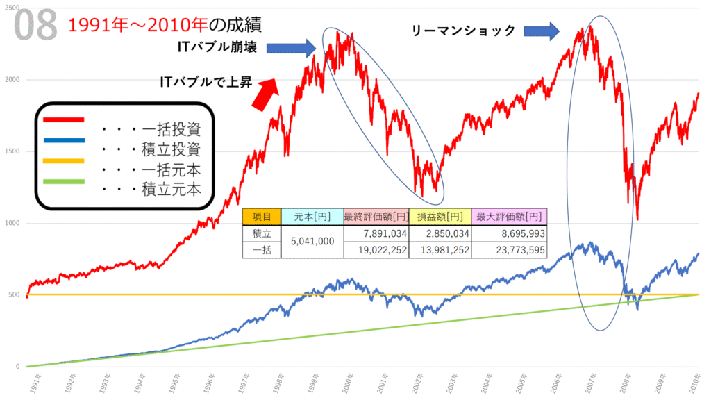 1991年から2010年の20年間、S&P500はバブルと暴落を繰り返しながらも長期的に成長しました。結果として一括投資は大きな利益をもたらしましたが、その過程には大きなリスクと不安定さも存在します。