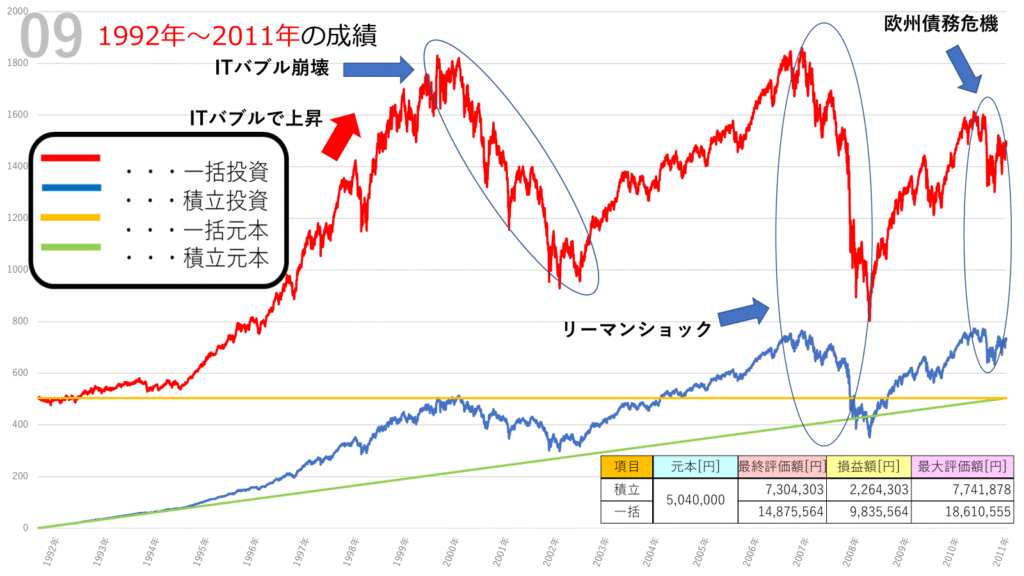 - 積立投資:1992年から2011年まで、毎日1000円ずつ投資(20年間で合計約504万円)