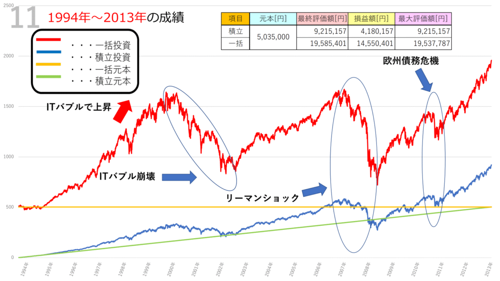 投資を始めると必ず気になるのが「一括投資と積立投資、どちらが有利なのか?」という点です。今回は1994年から2013年までの20年間を対象に、S&P500へ投資した場合のシミュレーション結果をご紹介します。実際のチャートをもとに、一括投資と積立投資それぞれの特徴やリスク、リターンについてわかりやすく解説していきます。投資を始めたばかりの方や、これから資産形成を考えている方にとって参考になるはずです。